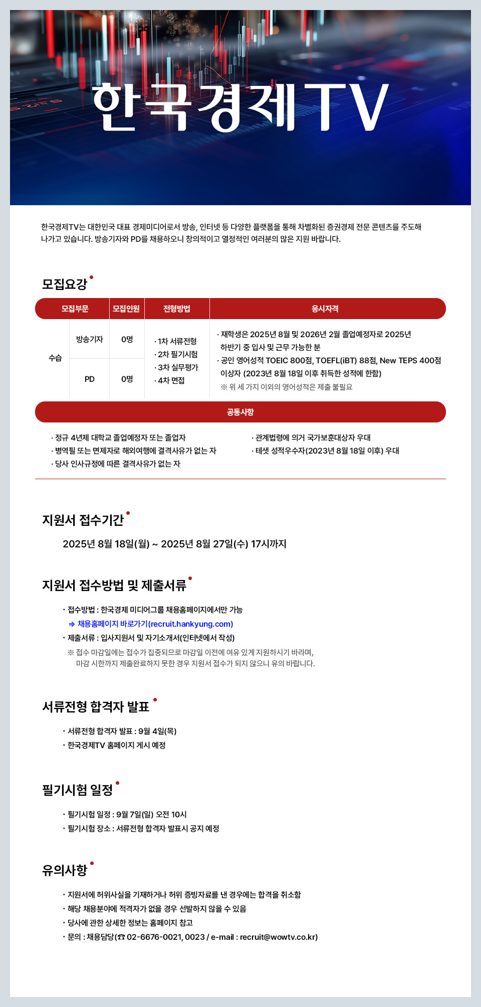 [[채용]][한국경제TV] 방송기자, PD 공개채용 작성자용기백개|작성시간25.08.13|조회수5,776 목록 댓글 0 글자크기 작게가 글자크기 크게가 다음검색 현재 게시글 추가 기능 열기 북마크 공유하기 신고 센터로 신고 댓글 댓글 0 댓글쓰기 답글쓰기 댓글 리스트