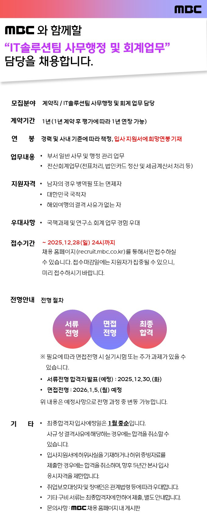 (채용) [MBC] IT솔루션팀 사무행정 담당 모집 작성자하면된다|작성시간25.12.16|조회수265 목록 댓글 0 글자크기 작게가 글자크기 크게가 ★ 공고 링크 : https://recruit.mbc.co.kr/redirect/recruit/apply_site.recruit.view/37486 다음검색 현재 게시글 추가 기능 열기 북마크 공유하기 신고 센터로 신고 댓글 댓글 0 댓글쓰기 답글쓰기 댓글 리스트