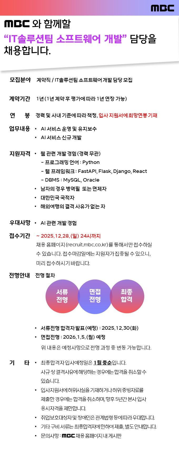 (채용) [MBC] IT솔루션팀 소프트웨어 개발 담당 모집 작성자하면된다|작성시간25.12.16|조회수160 목록 댓글 0 글자크기 작게가 글자크기 크게가 ★ 공고 링크 : https://recruit.mbc.co.kr/redirect/recruit/apply_site.recruit.view/37489 다음검색 현재 게시글 추가 기능 열기 북마크 공유하기 신고 센터로 신고 댓글 댓글 0 댓글쓰기 답글쓰기 댓글 리스트