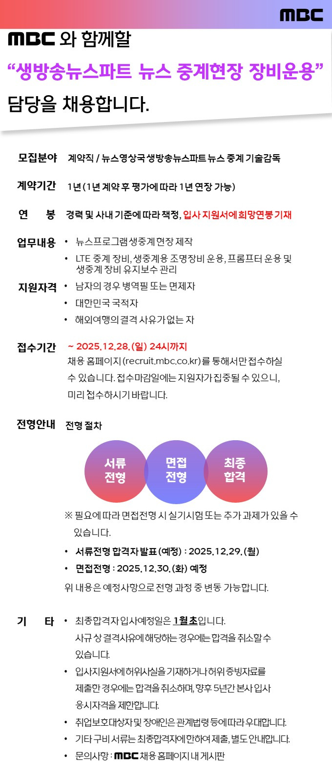 (채용) [MBC] 생방송뉴스파트 뉴스 중계현장 장비운용 담당 모집 작성자하면된다|작성시간25.12.16|조회수374 목록 댓글 0 글자크기 작게가 글자크기 크게가 ★ 공고 링크 : https://recruit.mbc.co.kr/redirect/recruit/apply_site.recruit.view/37487 다음검색 현재 게시글 추가 기능 열기 북마크 공유하기 신고 센터로 신고 댓글 댓글 0 댓글쓰기 답글쓰기 댓글 리스트