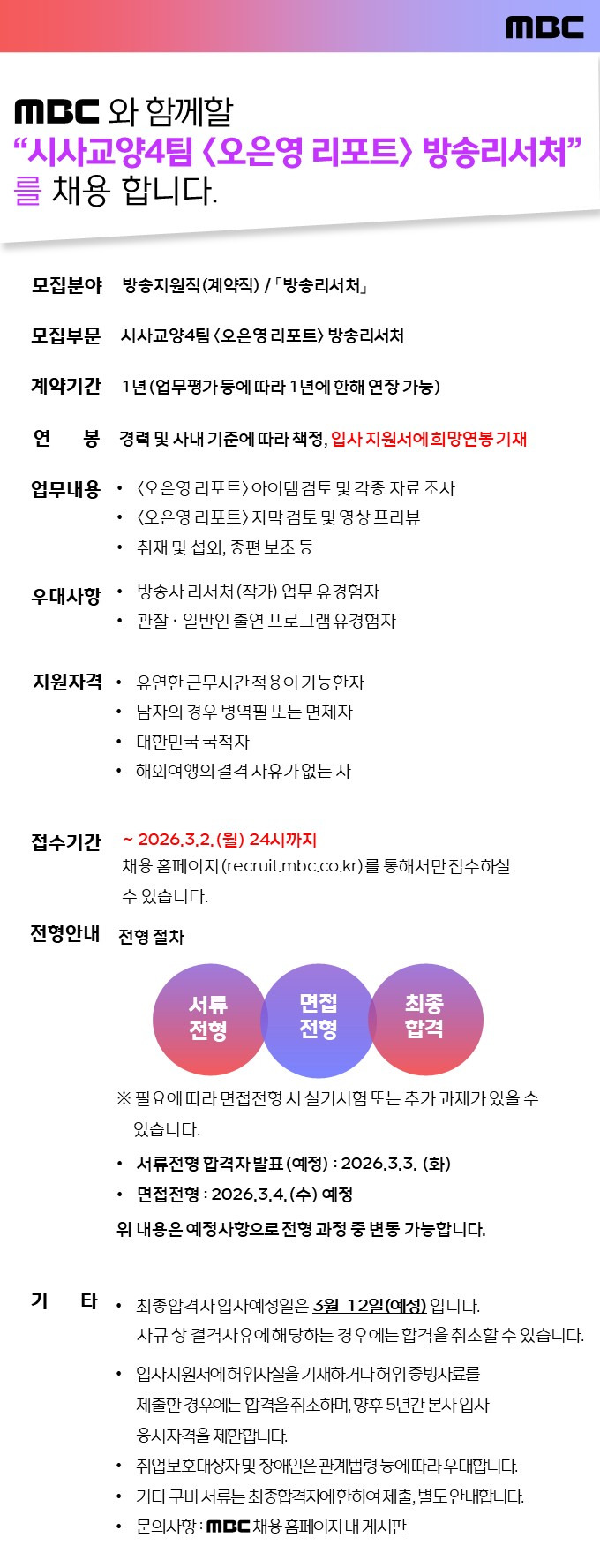 (채용)[MBC] 시사교양4팀 방송지원직 담당 모집(오은영리포트) 작성자하면된다|작성시간26.02.25|조회수471 목록 댓글 0 글자크기 작게가 글자크기 크게가 ★공고 링크 : https://recruit.mbc.co.kr/redirect/recruit/apply_site.recruit.view/37616 다음검색 현재 게시글 추가 기능 열기 북마크 공유하기 신고 센터로 신고 댓글 댓글 0 댓글쓰기 답글쓰기 댓글 리스트