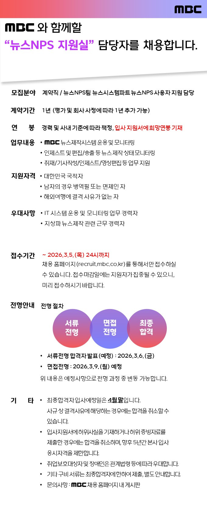 (채용)[MBC] 뉴스NPS팀 뉴스시스템파트 NPS지원 담당 모집 작성자하면된다|작성시간26.02.27|조회수147 목록 댓글 0 글자크기 작게가 글자크기 크게가 ★공고 링크 : https://recruit.mbc.co.kr/redirect/recruit/apply_site.recruit.view/37638 다음검색 현재 게시글 추가 기능 열기 북마크 공유하기 신고 센터로 신고 댓글 댓글 0 댓글쓰기 답글쓰기 댓글 리스트