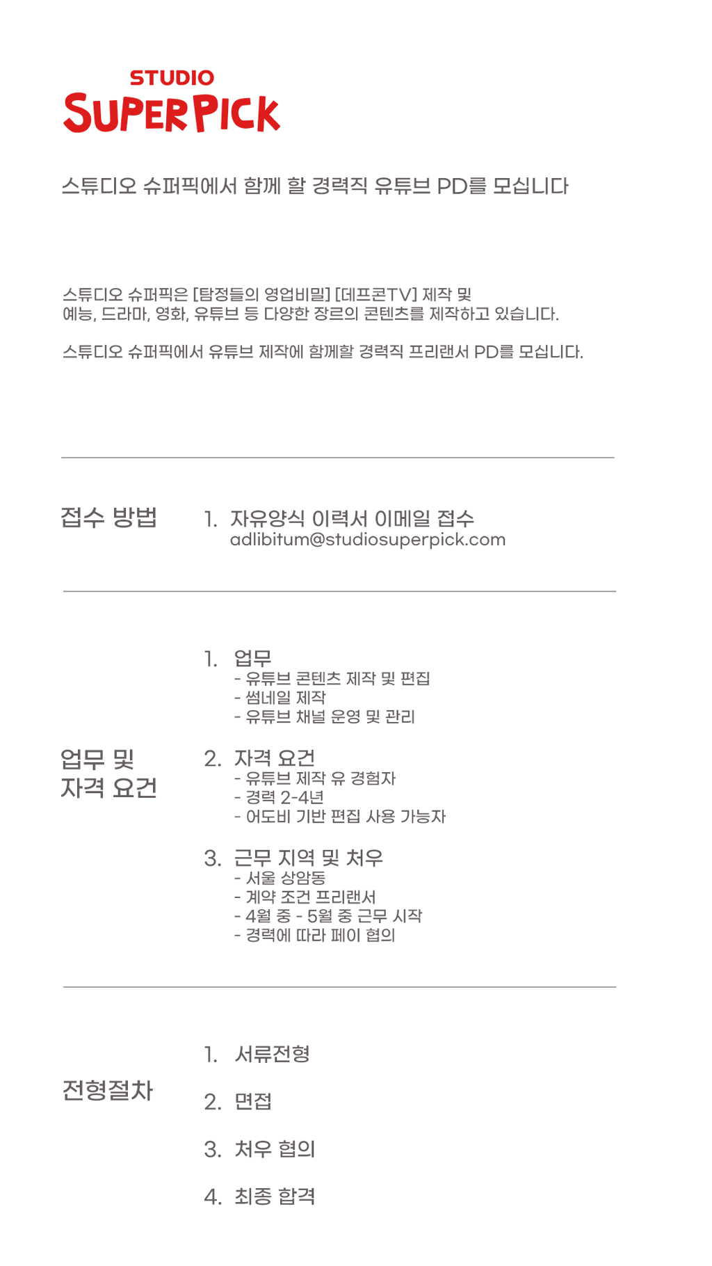 스튜디오 슈퍼픽에서 함께 할 유튜브 PD를 모십니다(경력) 작성자찰떡콩떡|작성시간26.03.31|조회수1,206 목록 댓글 0 글자크기 작게가 글자크기 크게가 지원 메일 : adlibitum@studiosuperpick.com서류 합격자에 한해 개별 연락을 드리겠습니다.감사합니다. 다음검색 현재 게시글 추가 기능 열기 북마크 공유하기 신고 센터로 신고 댓글 댓글 0 댓글쓰기 답글쓰기 댓글 리스트