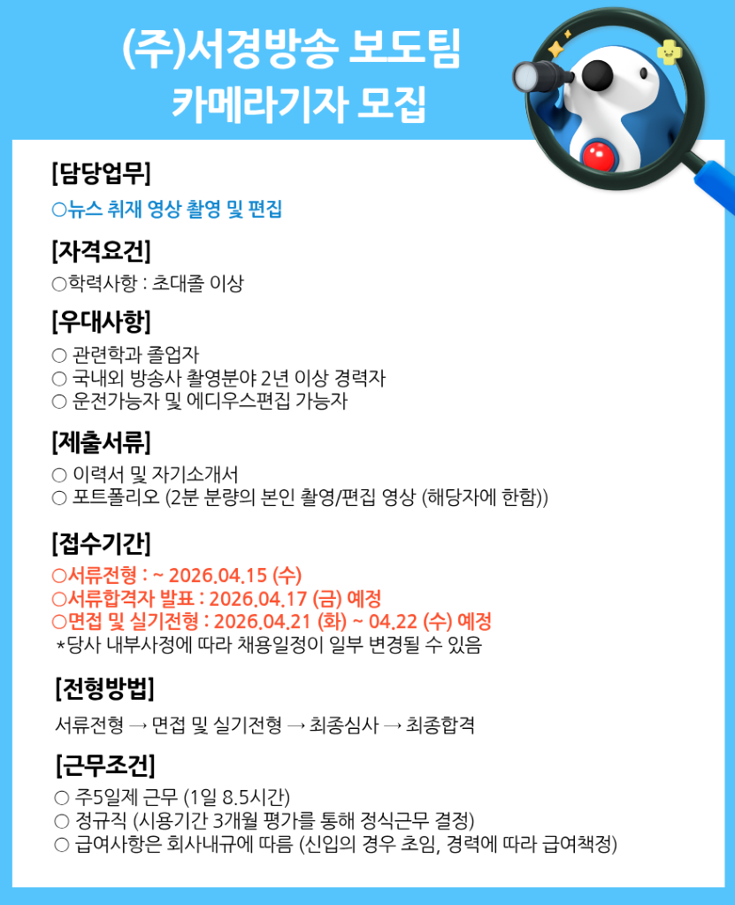 [SCS서경방송] 카메라기자 신입 및 경력 채용공고