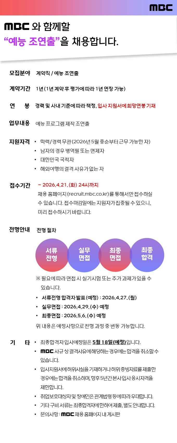 [[채용]]MBC 예능본부 예능 조연출 모집 작성자돈츄메이커랑츠|작성시간26.04.11|조회수2,909 목록 댓글 0 글자크기 작게가 글자크기 크게가 https://recruit.mbc.co.kr/redirect/recruit/apply_site.recruit.view/37717 다음검색 현재 게시글 추가 기능 열기 북마크 공유하기 신고 센터로 신고 댓글 댓글 0 댓글쓰기 답글쓰기 댓글 리스트