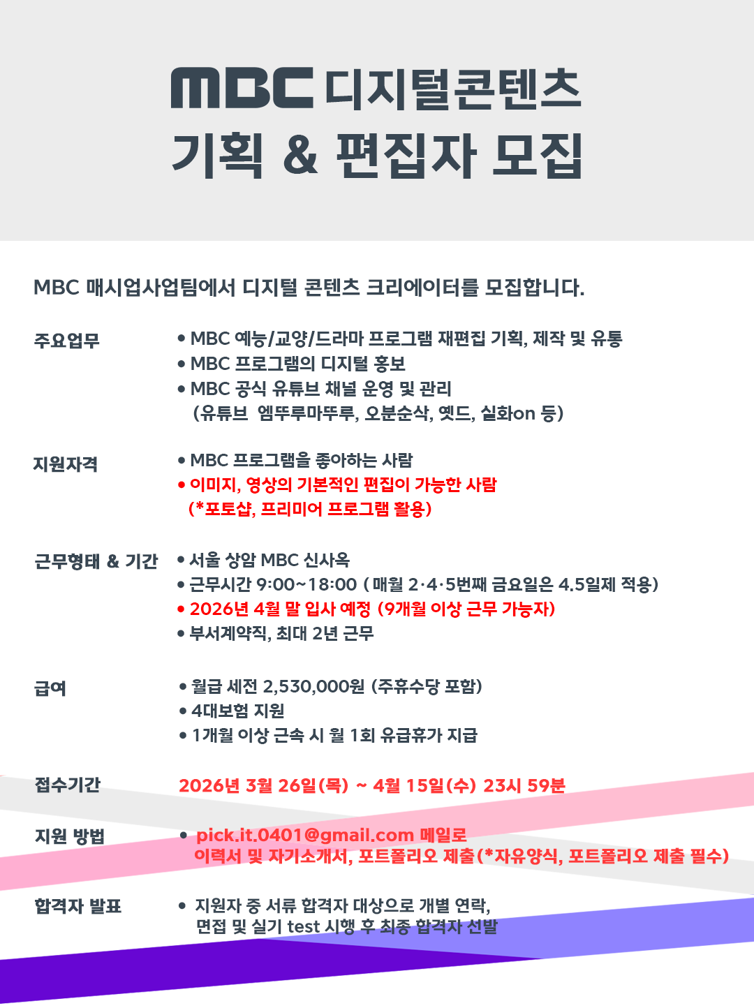 [채용/4월 15일 마감!] MBC 유튜브 디지털콘텐츠 콘텐츠 기획&편집자 모집 작성자김진짱|작성시간26.04.13|조회수1,326 목록 댓글 0 글자크기 작게가 글자크기 크게가 다음검색 현재 게시글 추가 기능 열기 북마크 공유하기 신고 센터로 신고 댓글 댓글 0 댓글쓰기 답글쓰기 댓글 리스트