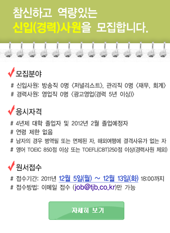 TJB에서 방송기자의 꿈을 펼칠 유능한 후배님들의 지원을 기다리겠습니다.