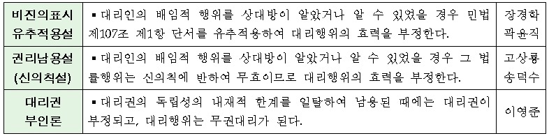 ※ 판례는 대체로 비진의표시유추적용설에 따라 해결하고 있으나, 대표권 남용의 경우에는 신의칙설을 취하고 있다.