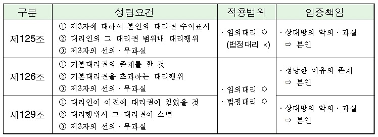 | 제129조 (代理權消滅後의 表見代理) 대리권의 소멸은 선의의 제3자(거래행위의 상대방)에게 대항하지 못한다. 그러나 제3자가 과실로 인하여 그 사실을 알지 못한 때에는 그러하지 아니하다. |