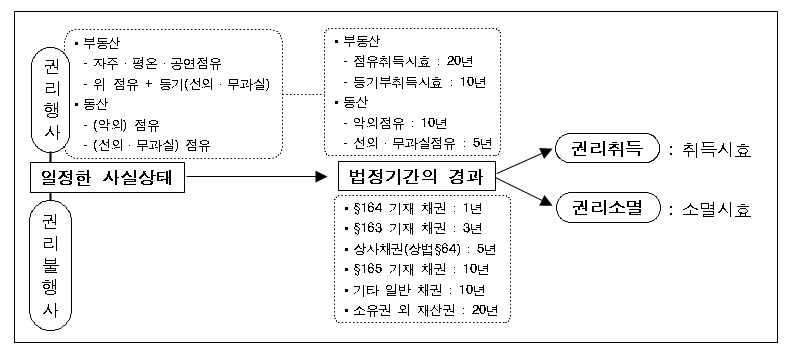 권리행사의 사실상태가 일정기간 계속된 경우에 권리의 "취득"을 인정하는 것이 取得時效이고, 권리불행사의 사실상태가 일정기간 계속된 경우에 권리의 "소멸"을 인정하는 것이 消滅時效이다. 우리 민법은 소멸시효를 총칙편에서 규정하고, 취득시효는 물권편에서 규정하고 있다(독일민법도 그러하다).