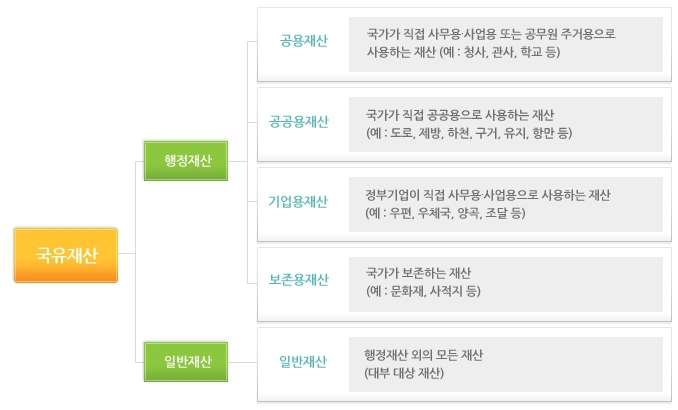 국유재산이란 국가가 행정목적을 수행하기 위해 필요로 하여 소유하고 있는 일체의 재산(광의) 및 국가의 부담이나 기부의 채납, 법령 또는 조약에 따라 국가소유로 된 재산(협의)를 말합니다.