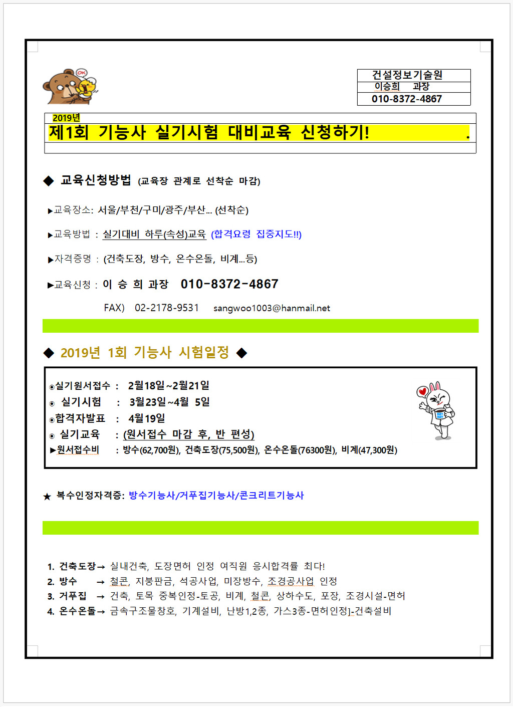 1. 기능사시험- (건축도장, 방수, 온수온돌,거푸집, 콘크리트.비계..등)을 합격하시면,