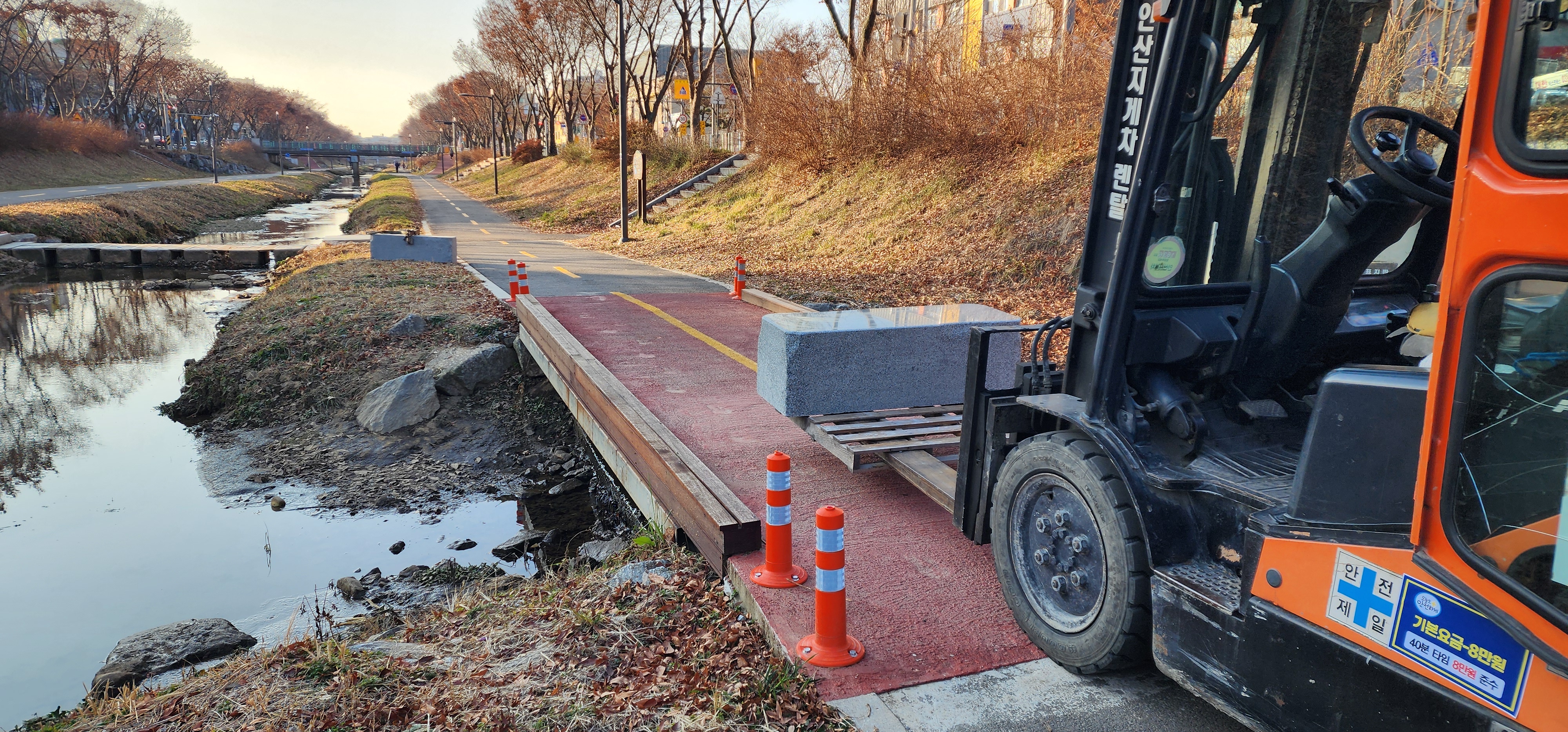 몇년전에 이곳 하천변에서 데크가 깔린 다리위를 지게차를 지나가다가
