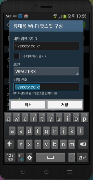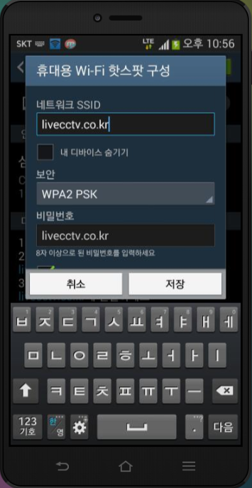 SSID 와 비밀번호 만들었으면, 저장터치