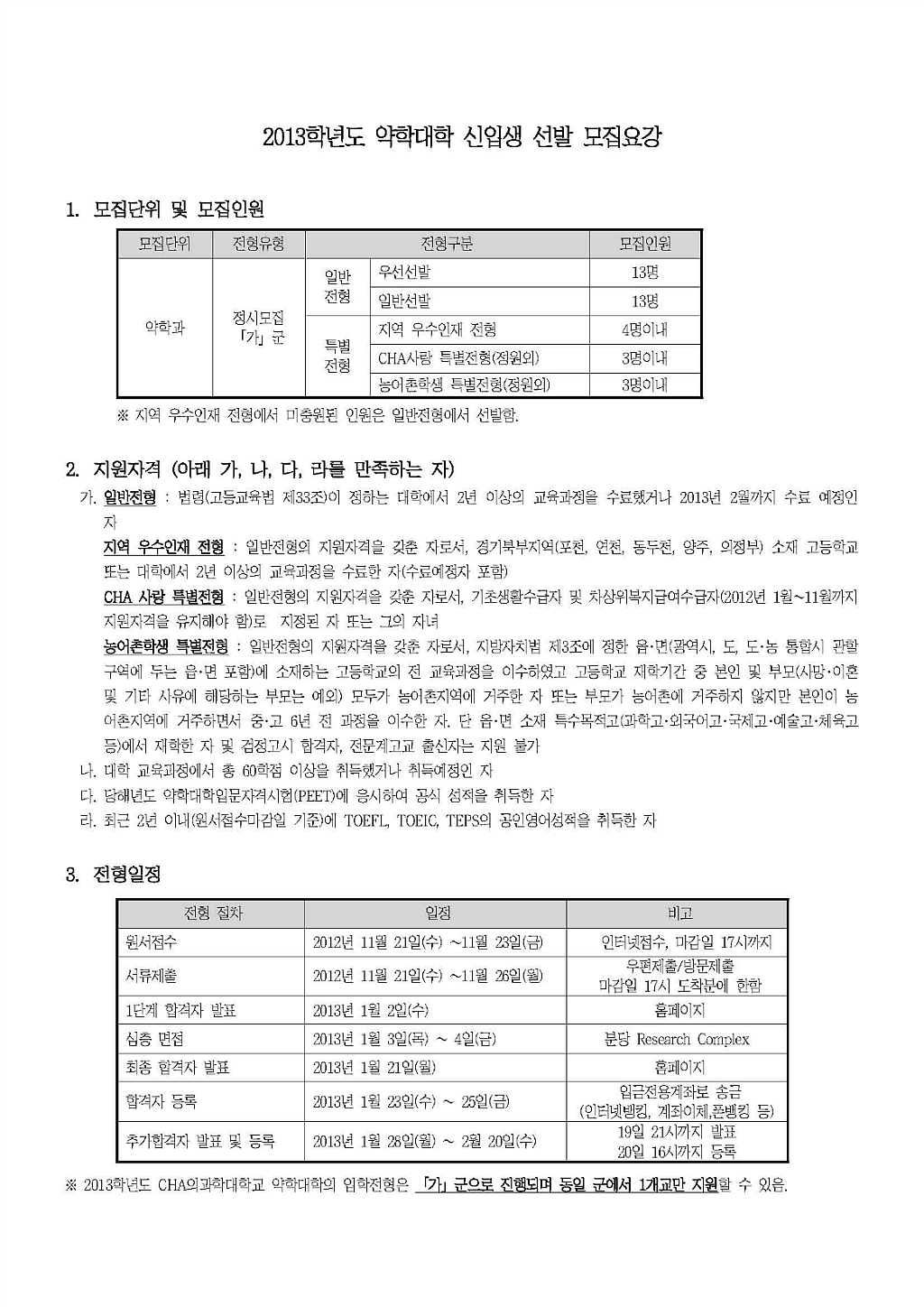 | 2013학년도 약학대학 신입생 선발 모집요강 |