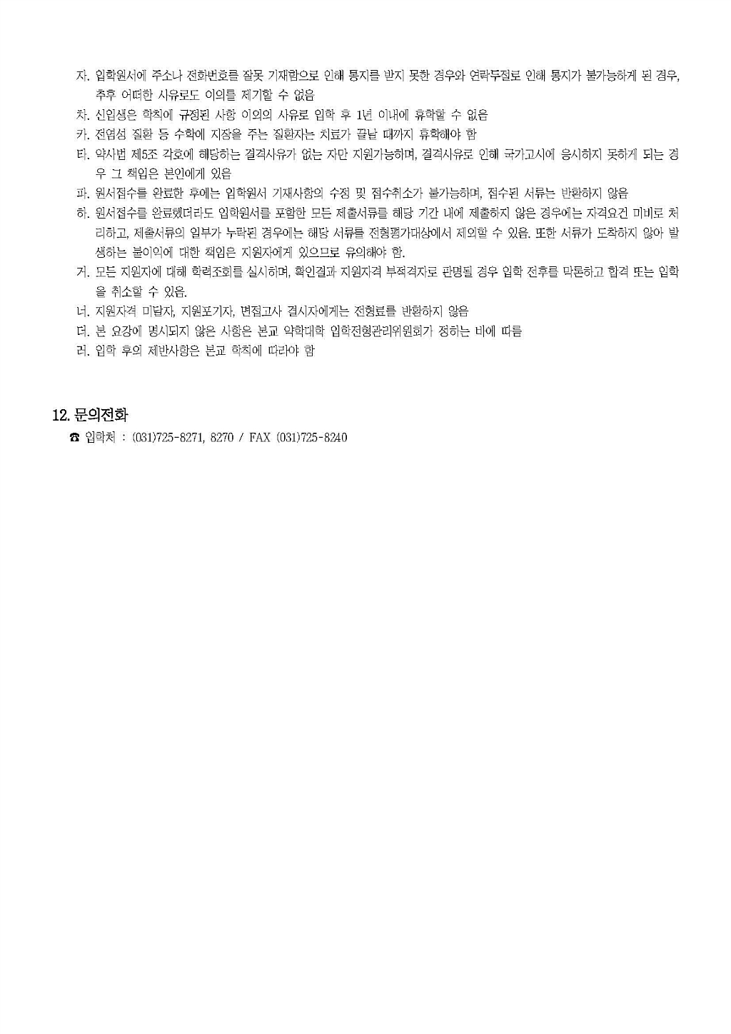 입학원서에 주소나 전화번호를 잘못 기재함으로 인해 통지를 받지 못한 경우와 연락두절로 인해 통지가 불가능하게 된 경우, 추후 어떠한 사유로도 이의를 제기할 수 없음 |