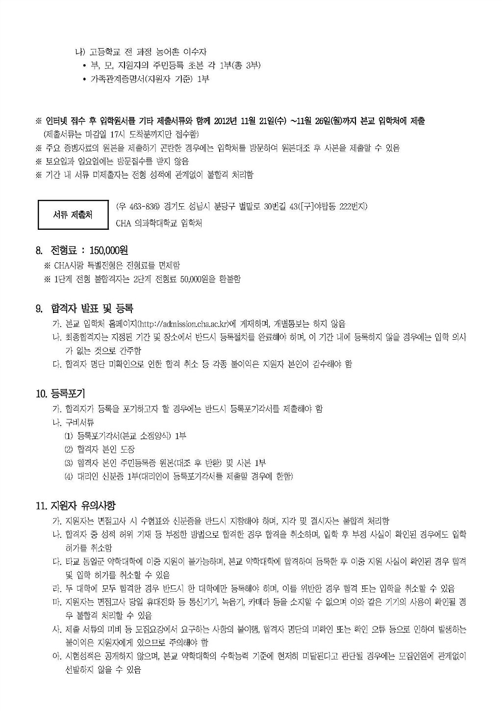 본교 입학처 홈페이지(http://admission.cha.ac.kr)에 게재하며, 개별통보는 하지 않음 |