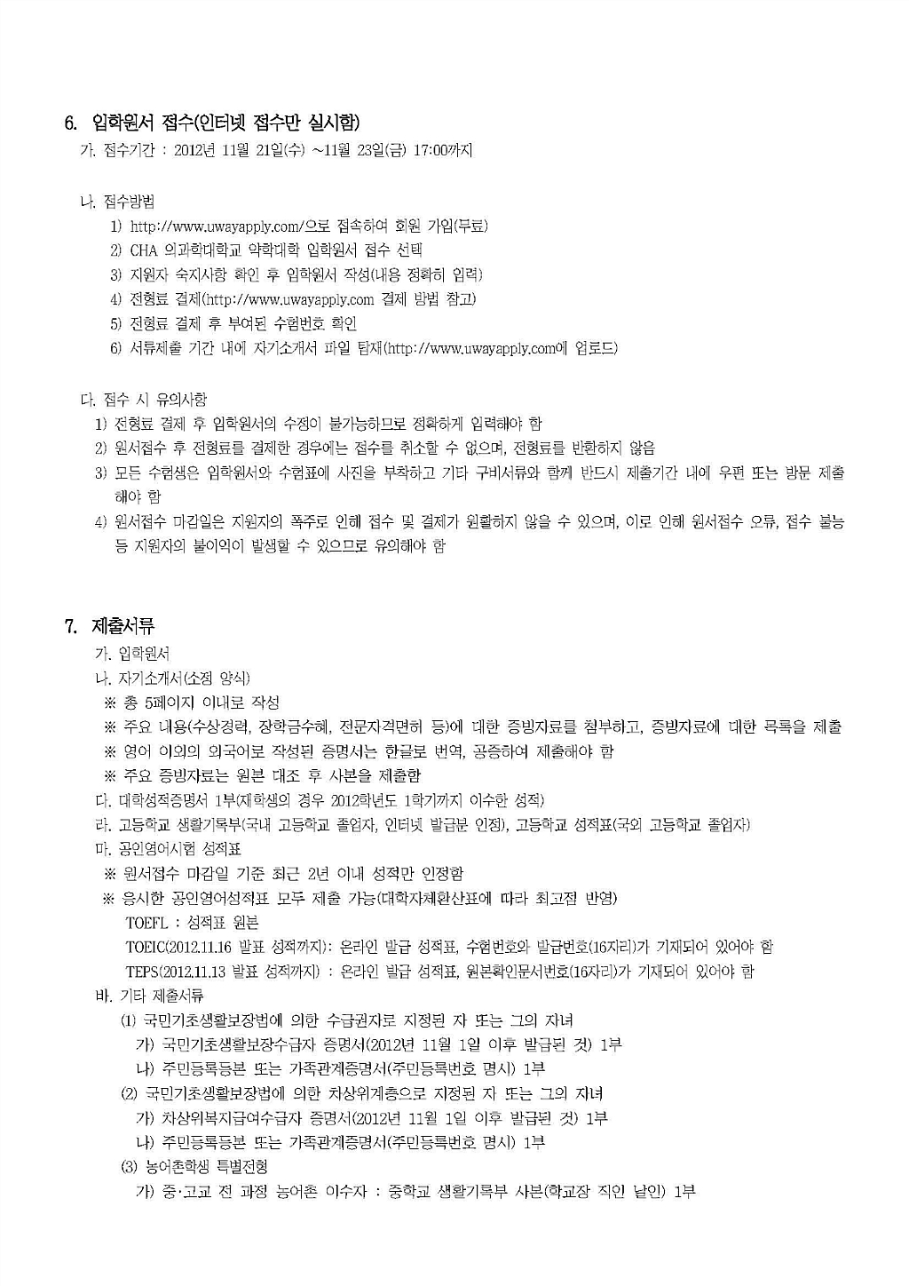 | CHA사랑 특별전형(정원외) | 3명이내 | |||