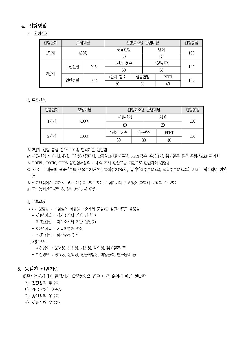 ※ 서류전형 : 자기소개서, 대학성적증명서, 고등학교생활기록부, PEET점수, 수상내역, 봉사활동 등을 종합적으로 평가함