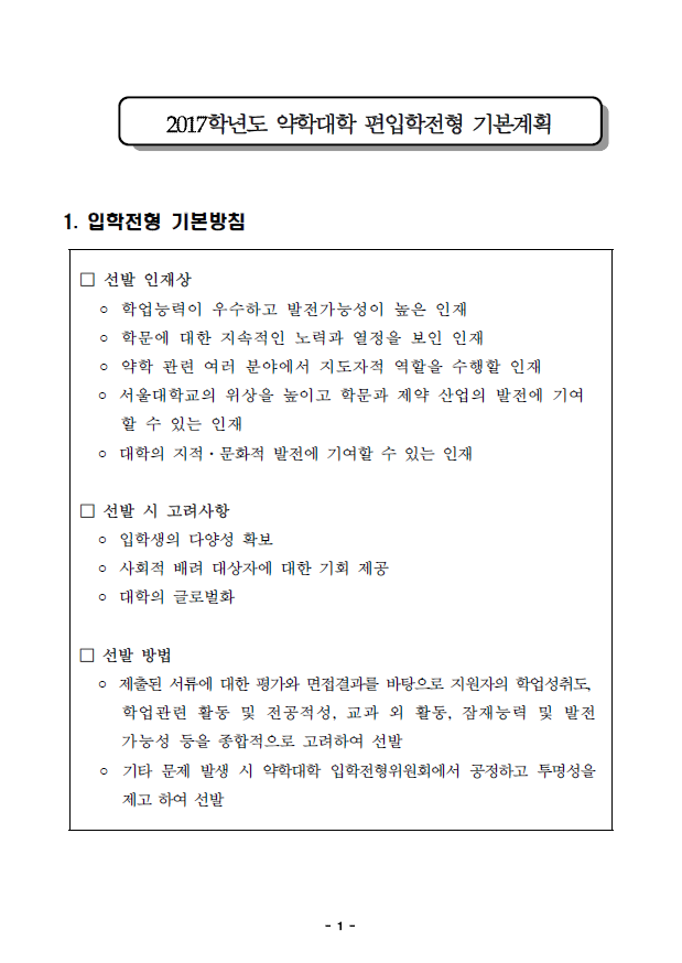 [기본계획]2017학년도 서울대학교 약학대학 편입학전형 기본계획 작성자Snow Flower|작성시간16.06.10|조회수1,517 목록 댓글 0 글자크기 작게가 글자크기 크게가 2017학년도_약학대학_편입학전형_기본계획.hwp 2017학년도_약학대학_편입학전형_기본계획.pdf 첨부파일첨부된 파일이 12개 있습니다. png 파일 1.png 다운로드 png 파일 2.png 다운로드 png 파일 3.png 다운로드 png 파일 4.png 다운로드 png 파일 5.png 다운로드 png 파일 6.png 다운로드 png 파일 7.png 다운로드 png 파일 8.png 다운로드 png 파일 9.png 다운로드 png 파일 10.png 다운로드 hwp 파일 2017학년도_약학대학_편입학전형_기본계획.hwp 다운로드 pdf 파일 2017학년도_약학대학_편입학전형_기본계획.pdf 다운로드 다음검색 현재 게시글 추가 기능 열기 북마크 공유하기 신고 센터로 신고 댓글 댓글 0 댓글쓰기 답글쓰기 댓글 리스트