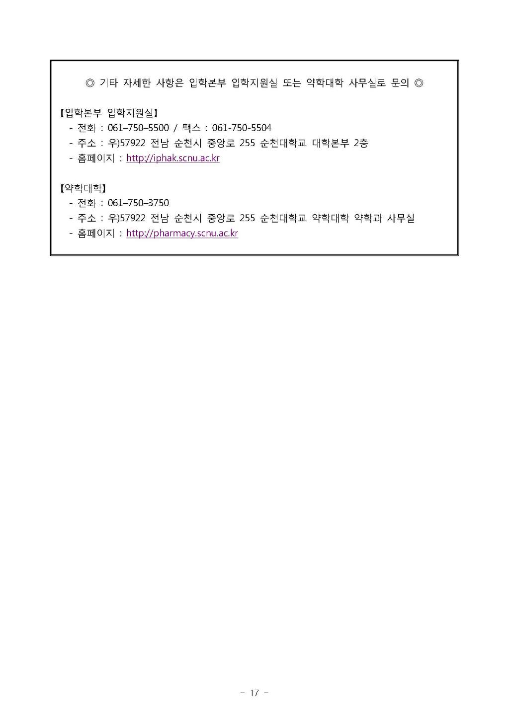 [전남최종]2020학년도 순천대 약학대학 모집요강 작성자superfly|작성시간19.08.10|조회수1,882 목록 댓글 0 글자크기 작게가 글자크기 크게가 pharmacy2020.pdf 첨부파일첨부된 파일이 18개 있습니다. jpg 파일 pharmacy2020_페이지_01.jpg 다운로드 jpg 파일 pharmacy2020_페이지_02.jpg 다운로드 jpg 파일 pharmacy2020_페이지_03.jpg 다운로드 jpg 파일 pharmacy2020_페이지_04.jpg 다운로드 jpg 파일 pharmacy2020_페이지_05.jpg 다운로드 jpg 파일 pharmacy2020_페이지_06.jpg 다운로드 jpg 파일 pharmacy2020_페이지_07.jpg 다운로드 jpg 파일 pharmacy2020_페이지_08.jpg 다운로드 jpg 파일 pharmacy2020_페이지_09.jpg 다운로드 jpg 파일 pharmacy2020_페이지_10.jpg 다운로드 jpg 파일 pharmacy2020_페이지_11.jpg 다운로드 jpg 파일 pharmacy2020_페이지_12.jpg 다운로드 jpg 파일 pharmacy2020_페이지_13.jpg 다운로드 jpg 파일 pharmacy2020_페이지_14.jpg 다운로드 jpg 파일 pharmacy2020_페이지_15.jpg 다운로드 jpg 파일 pharmacy2020_페이지_16.jpg 다운로드 jpg 파일 pharmacy2020_페이지_17.jpg 다운로드 pdf 파일 pharmacy2020.pdf 다운로드 다음검색 현재 게시글 추가 기능 열기 북마크 공유하기 신고 센터로 신고 댓글 댓글 0 댓글쓰기 답글쓰기 댓글 리스트