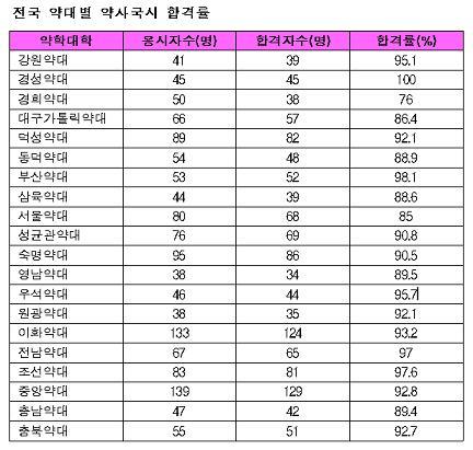 합격률 하위 대학은 경희대네요. 경희대는 약사고시 뿐만 아니라 한약사고시의 합격률도 우석대 원광대가 100%합격인데 비해서 그리 높지 않은 것으로 알고있습니다. -