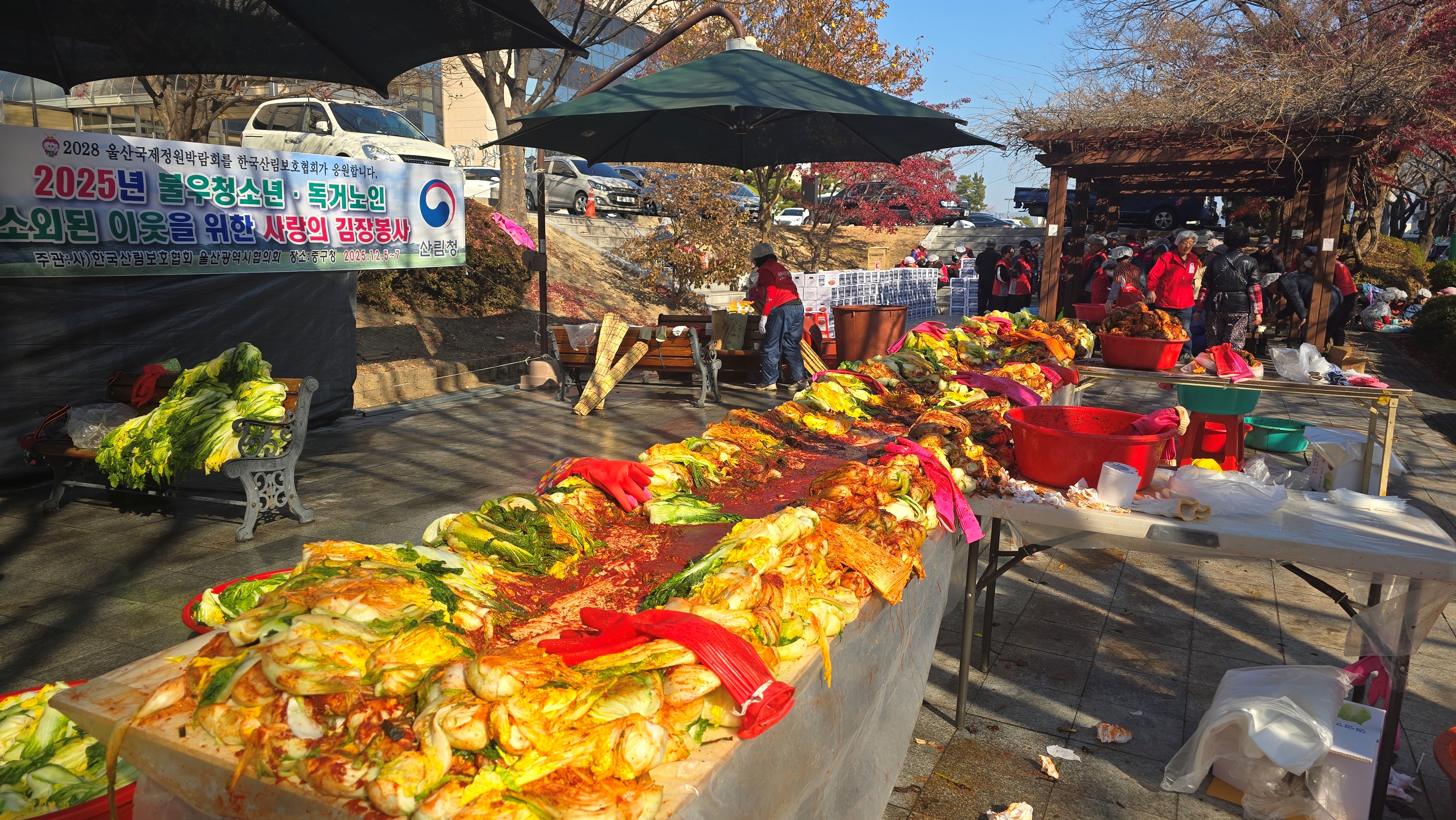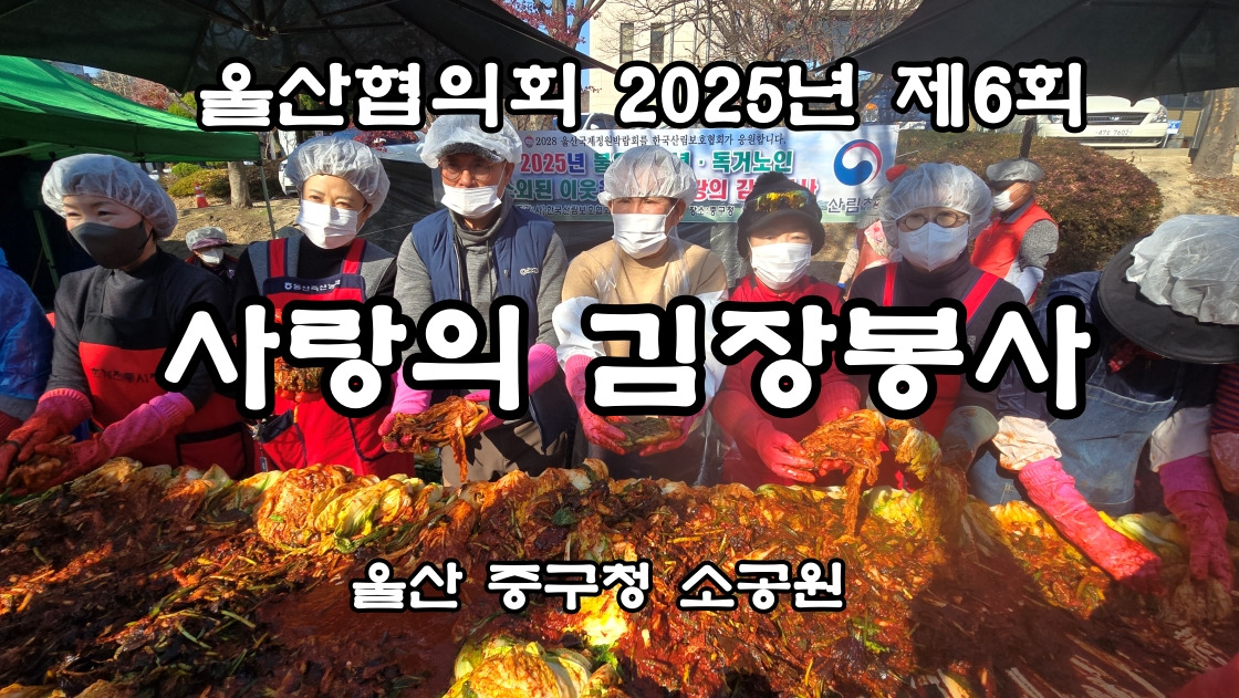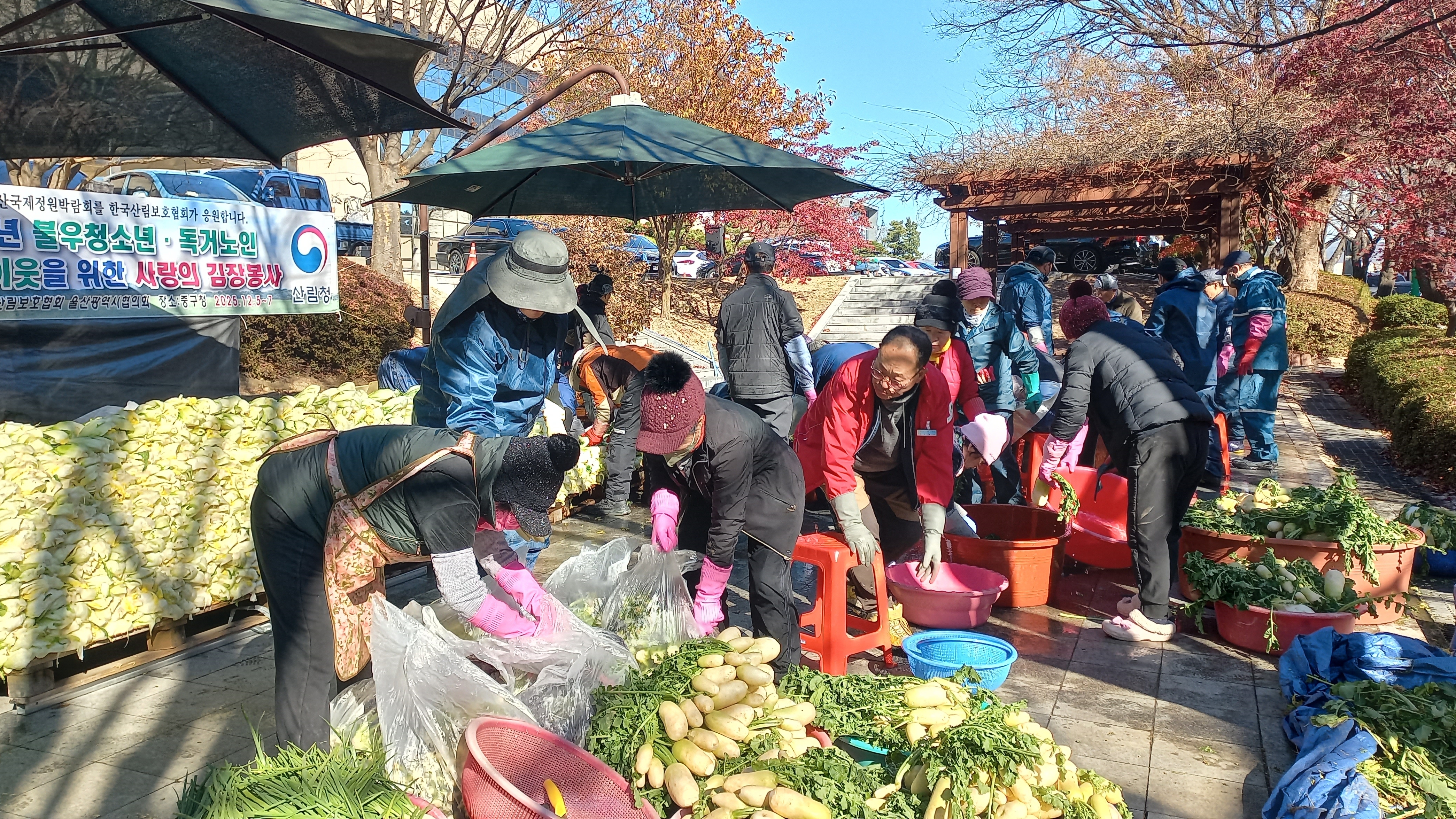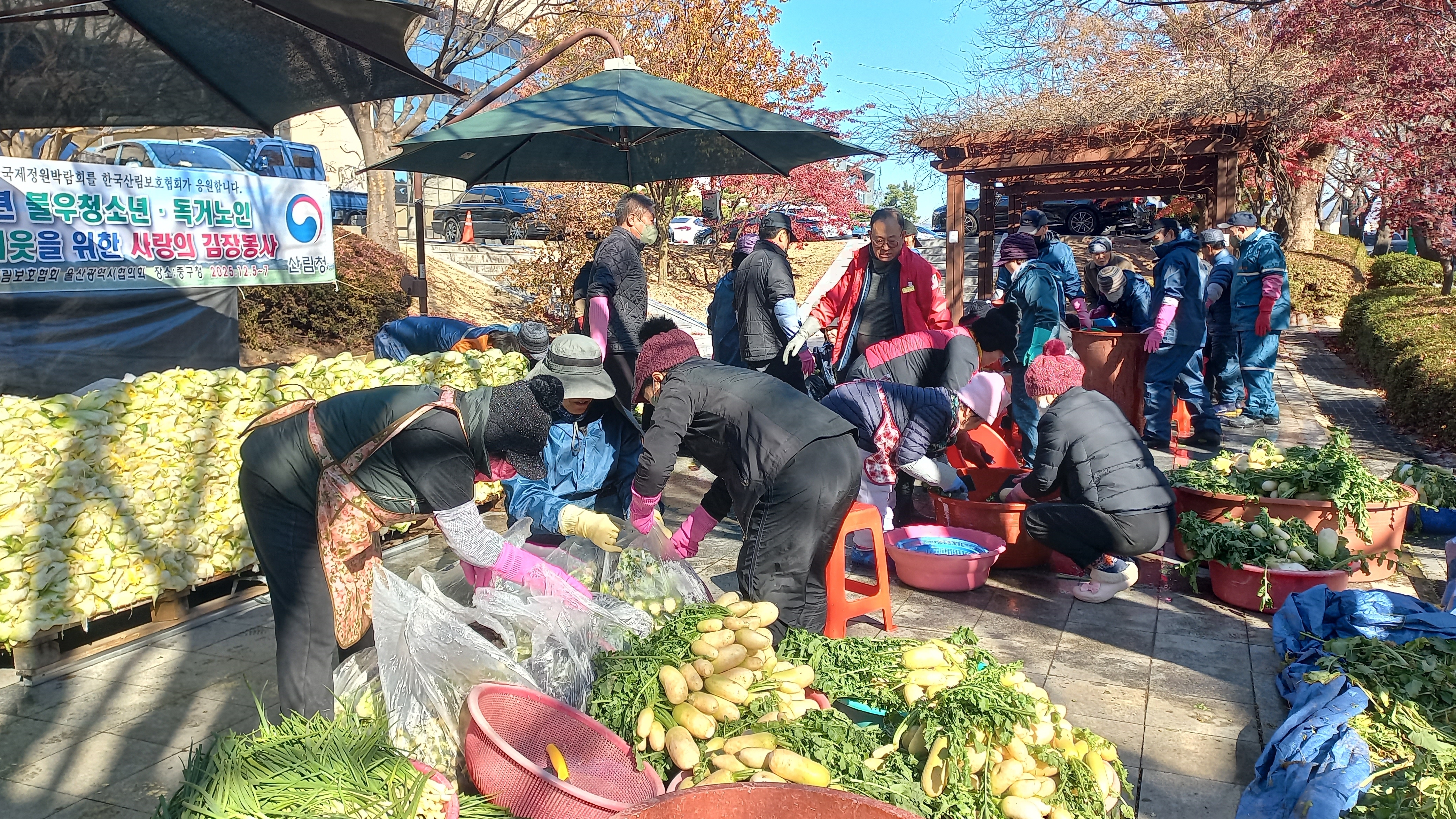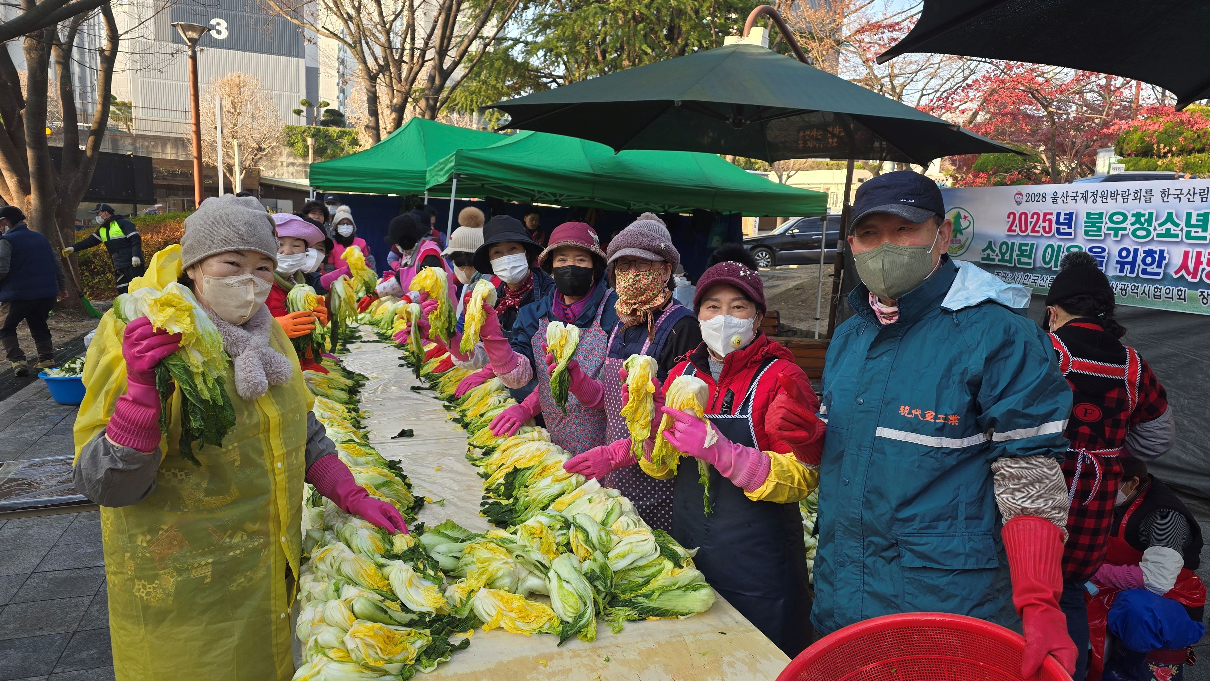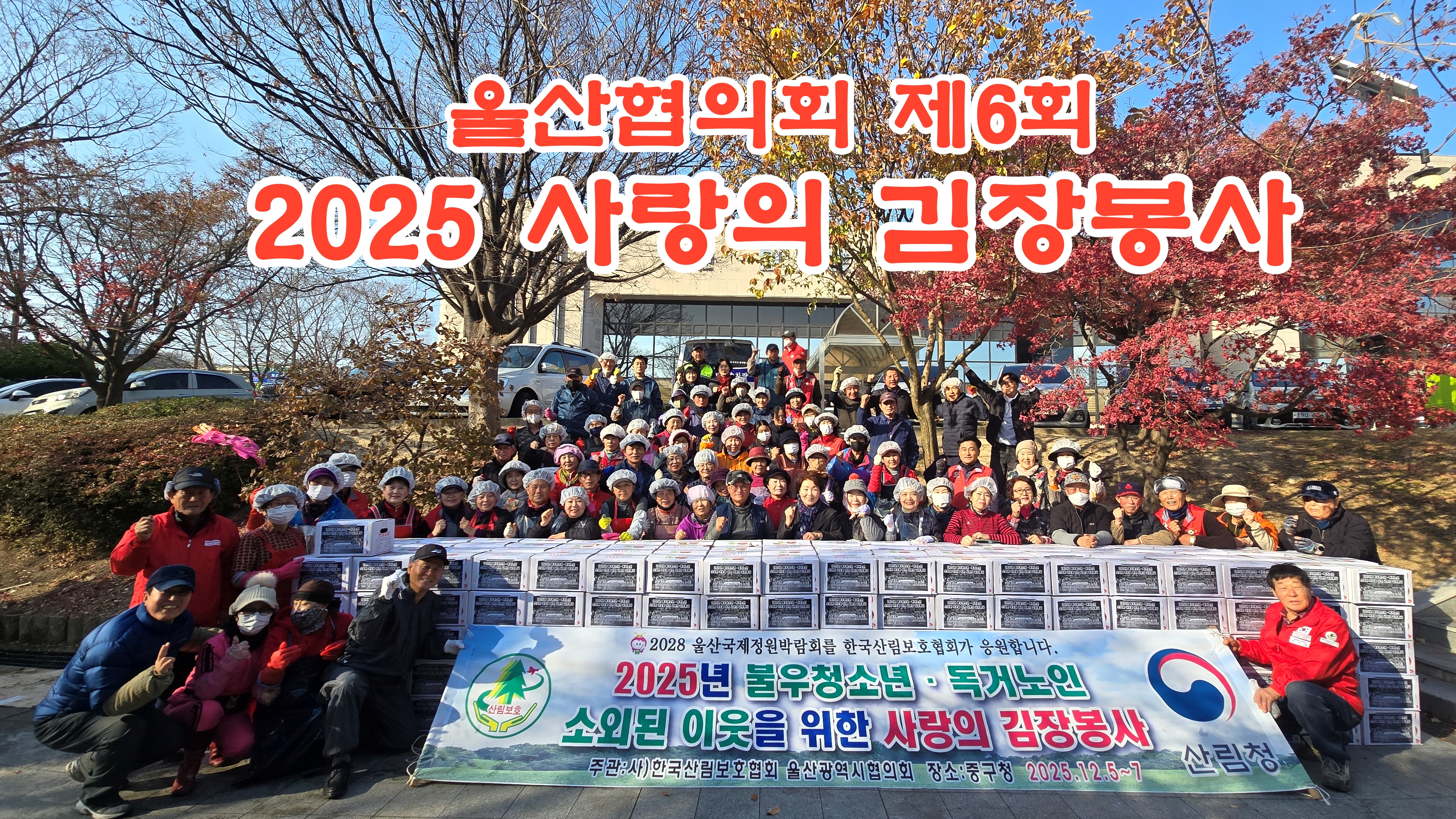 (사)한국산림보호협회 울산협의회 제6회 2025년 사랑의 김장담기 봉사활동으로 김철호 회장외 총 200여명은 12월 4일(목)~7일(일) 4일간 울산시 중구청 소공원내 광장에서 중구청의 수도등 시설 이용 지원을 받아 산보협 봉사농원 수확 배추 4,000포기, 무우 30포대로 500박스 김장을 담았다
