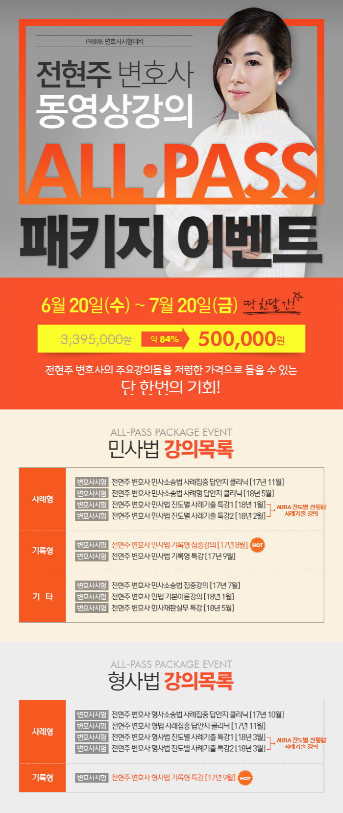 [프라임] 전현주 변호사 동영상강의 ALL-PASS 패키지 이벤트| 작성자카페_변준모|작성시간18.07.08|조회수35 목록 댓글 0 글자크기 작게가 글자크기 크게가 다음검색 현재 게시글 추가 기능 열기 북마크 공유하기 신고 센터로 신고 댓글 댓글 0 댓글쓰기 답글쓰기 댓글 리스트