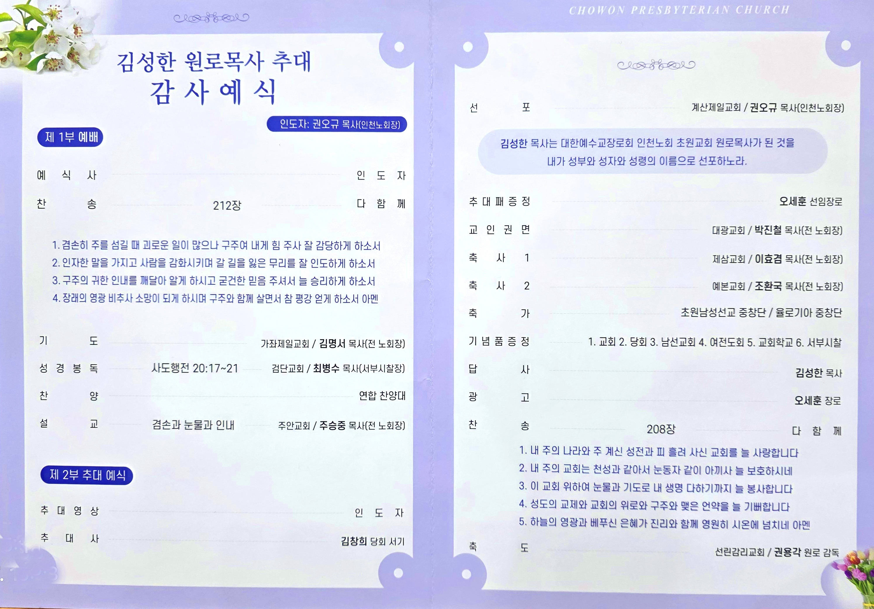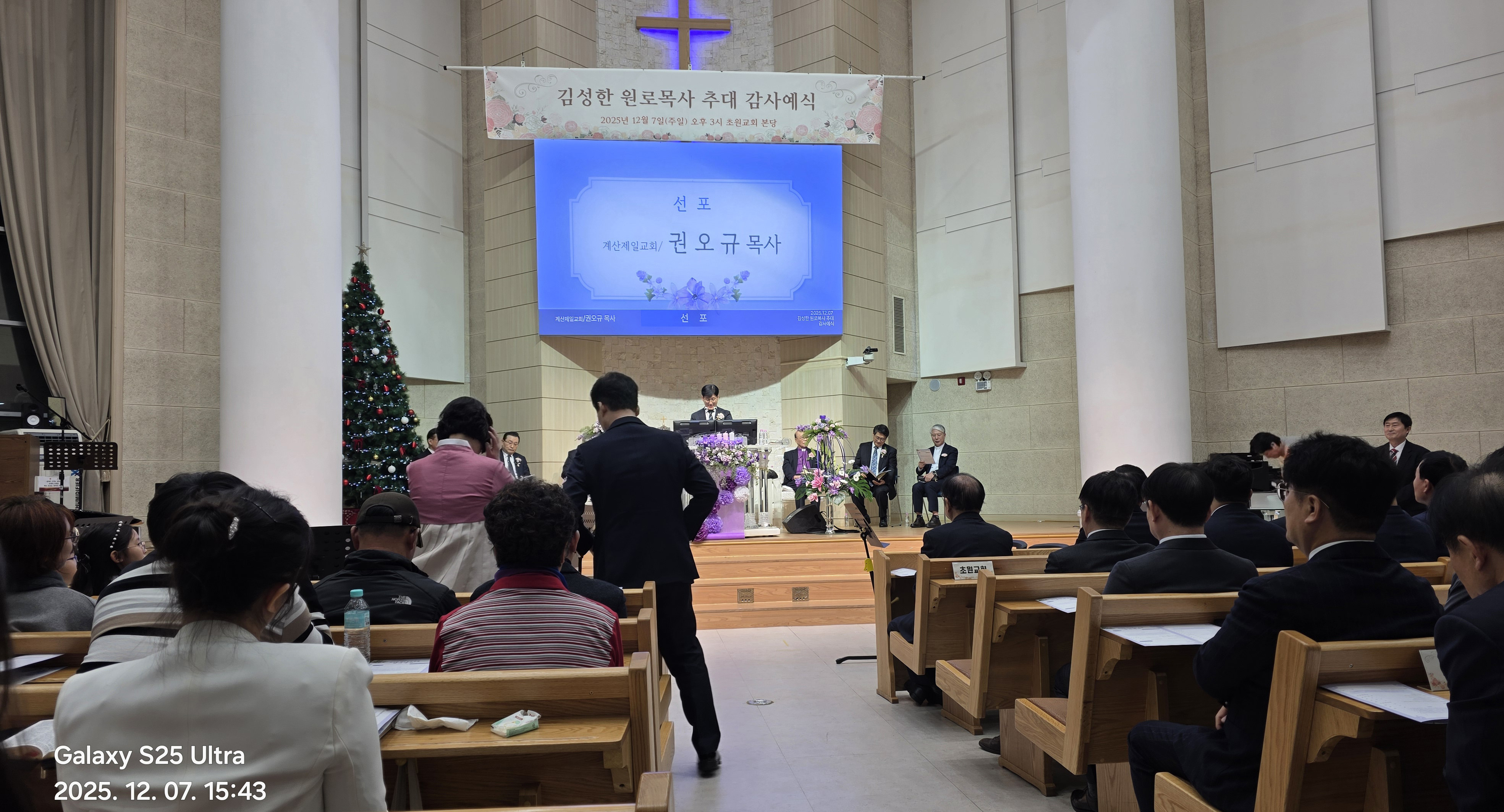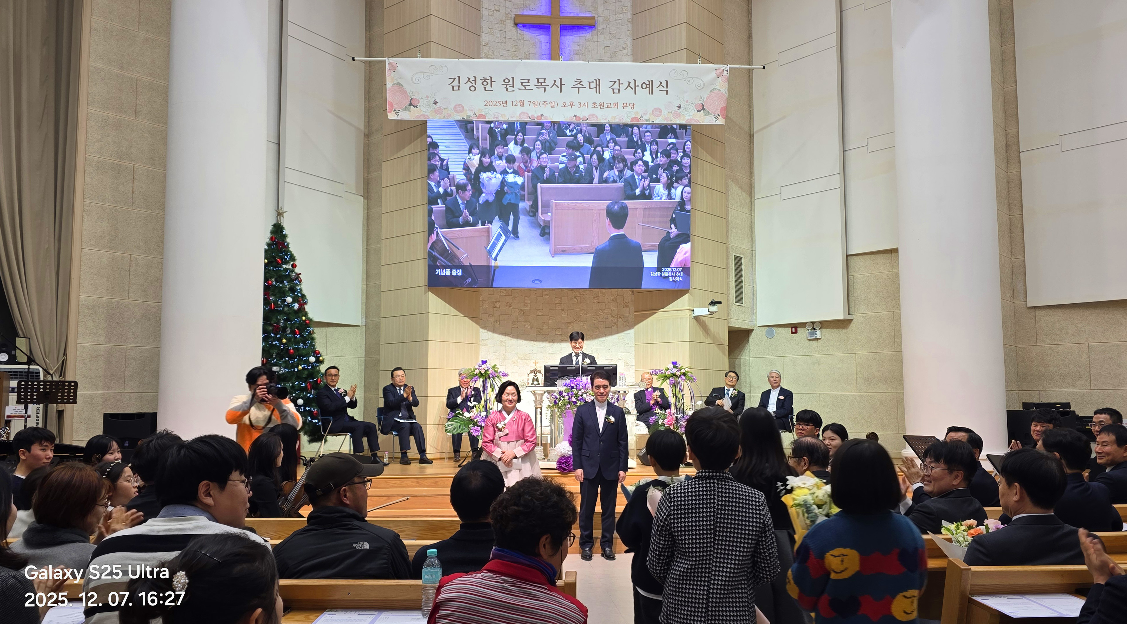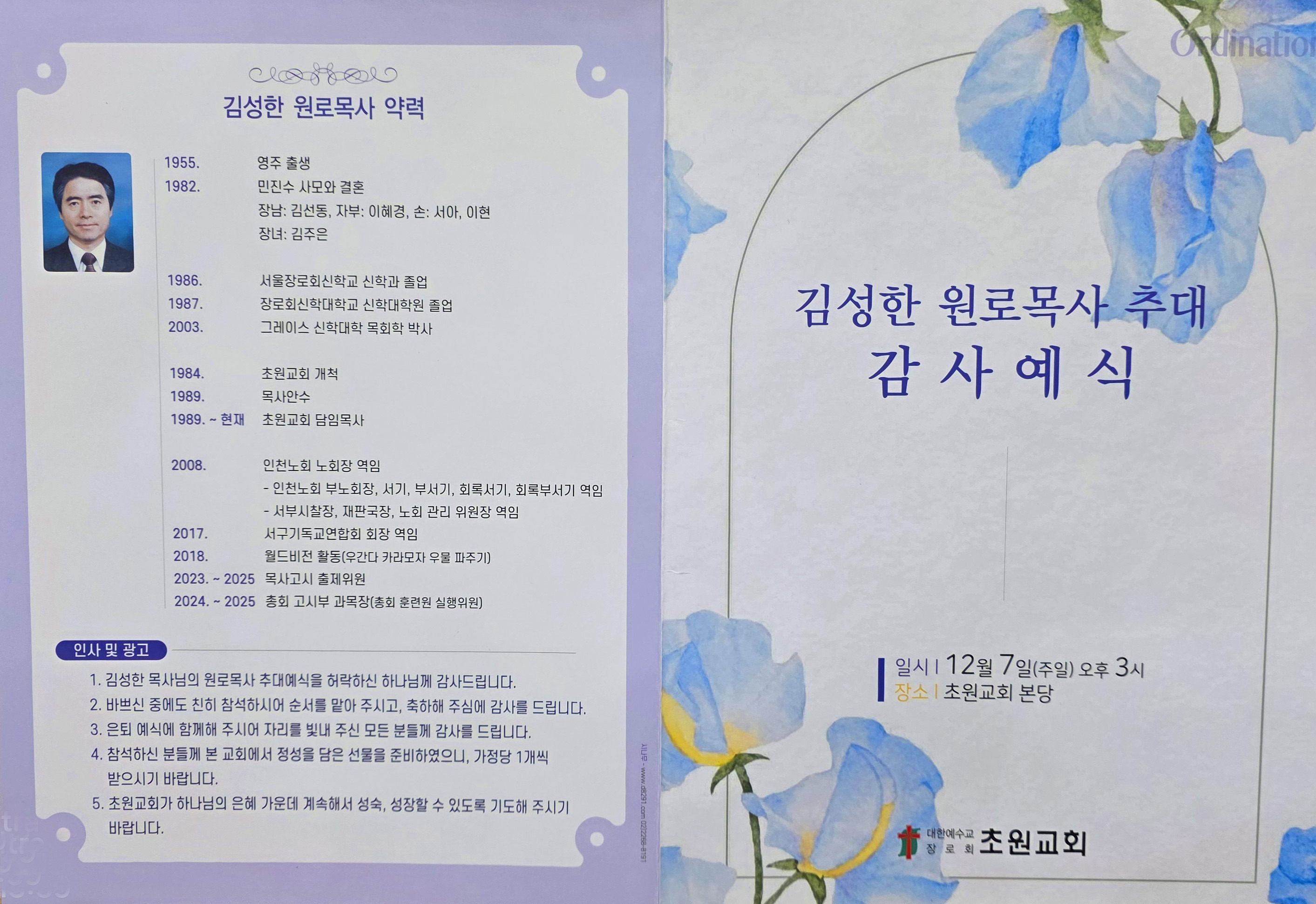 인천노회(노회장:권오규 목사) 서부시찰 초원교회 김성한 원로목사님 추대예배를 2025년 12월 7일(주일) 오후 3시에 인천광역시 서구 청라신도시에 위치한 초원교회에서 아래와 같이 드렸습니다.