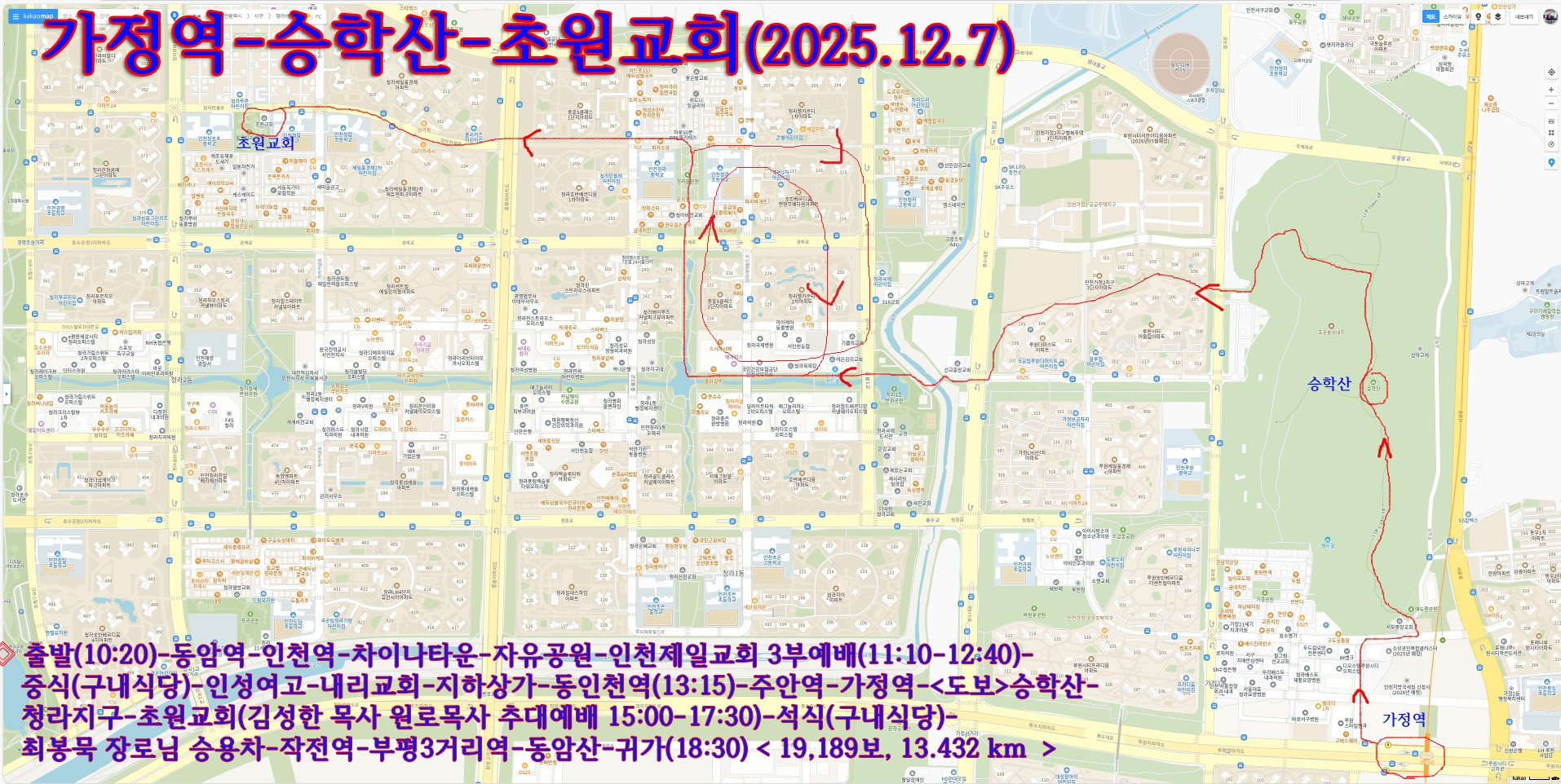출발(10:20)-동암역-인천역-차이나타운-자유공원-인천제일교회 3부예배(11:10-12:40)-중식(구내식당)-인성여고-내리교회-지하상가-동인천역(13:20)-주안역-가정역(13:50)-<도보>승학산-청라지구-청라중학교와 청람중학교사이를 해맴-초원교회(김성한 목사 원로목사 추대예배 16:00-17:30)-석식(구내식당)-최봉묵 장로님 승용차-작전역-부평3거리역-동암산-귀가(18:30) < 19,189보, 13.432 km >