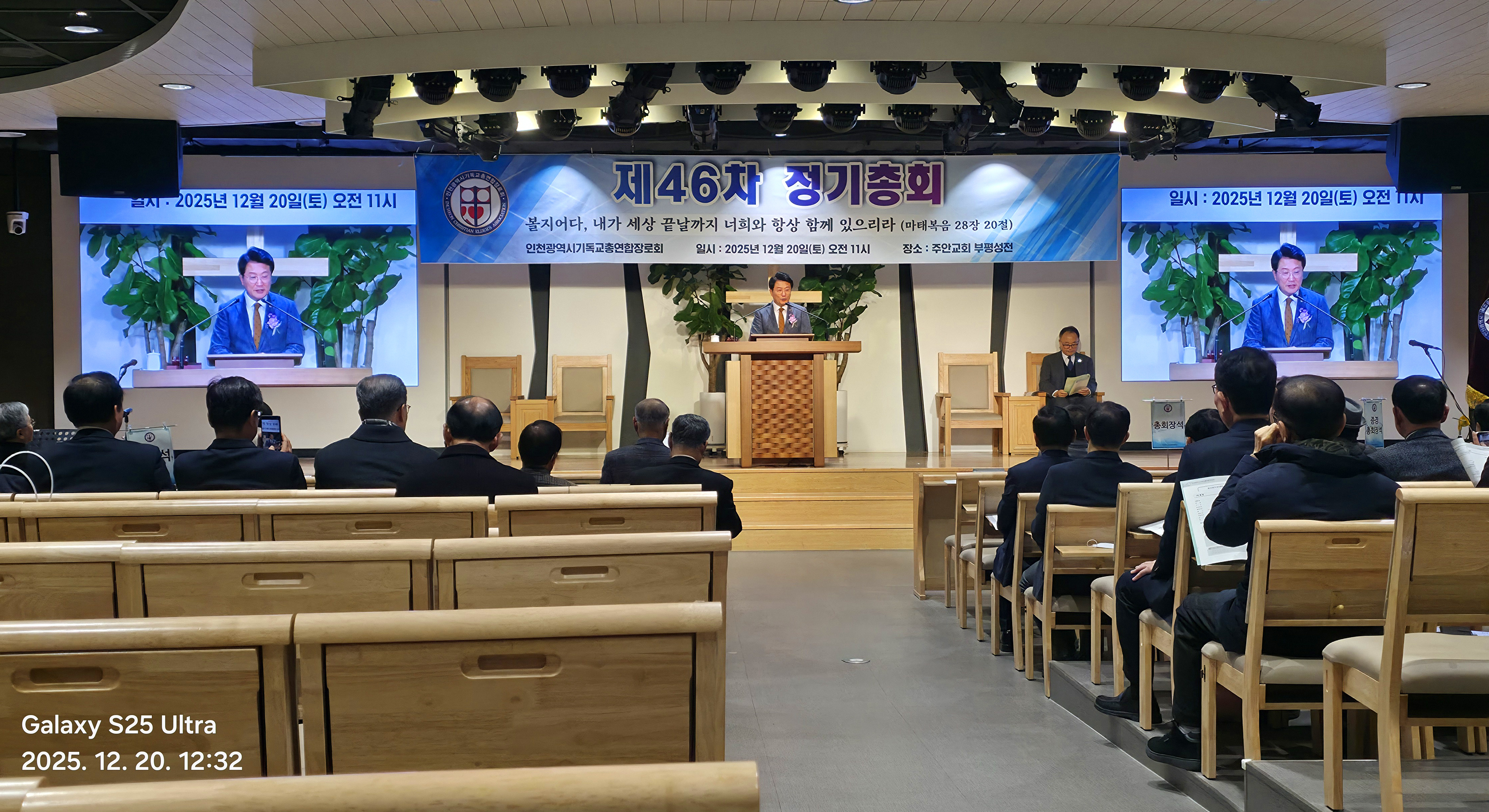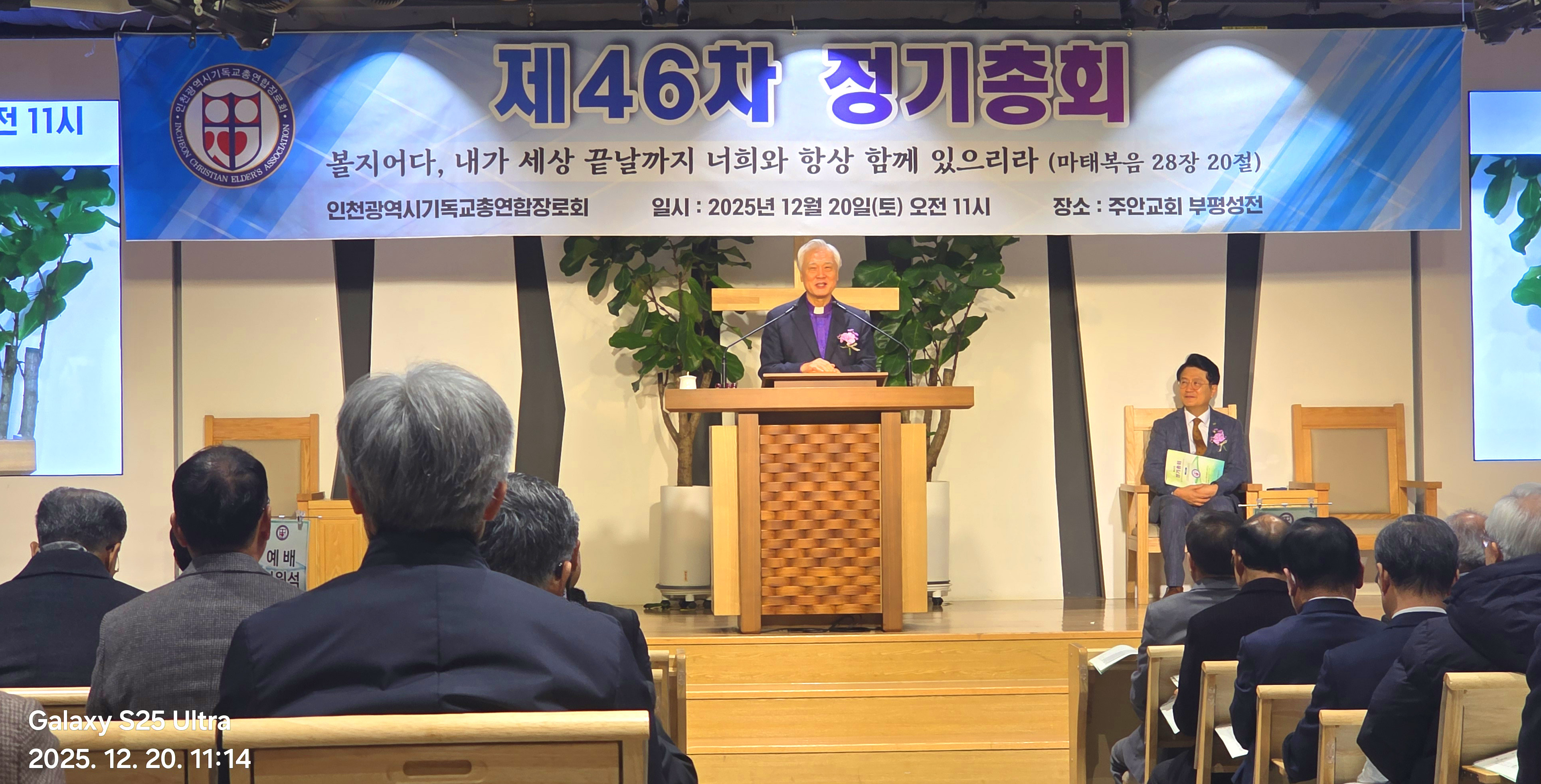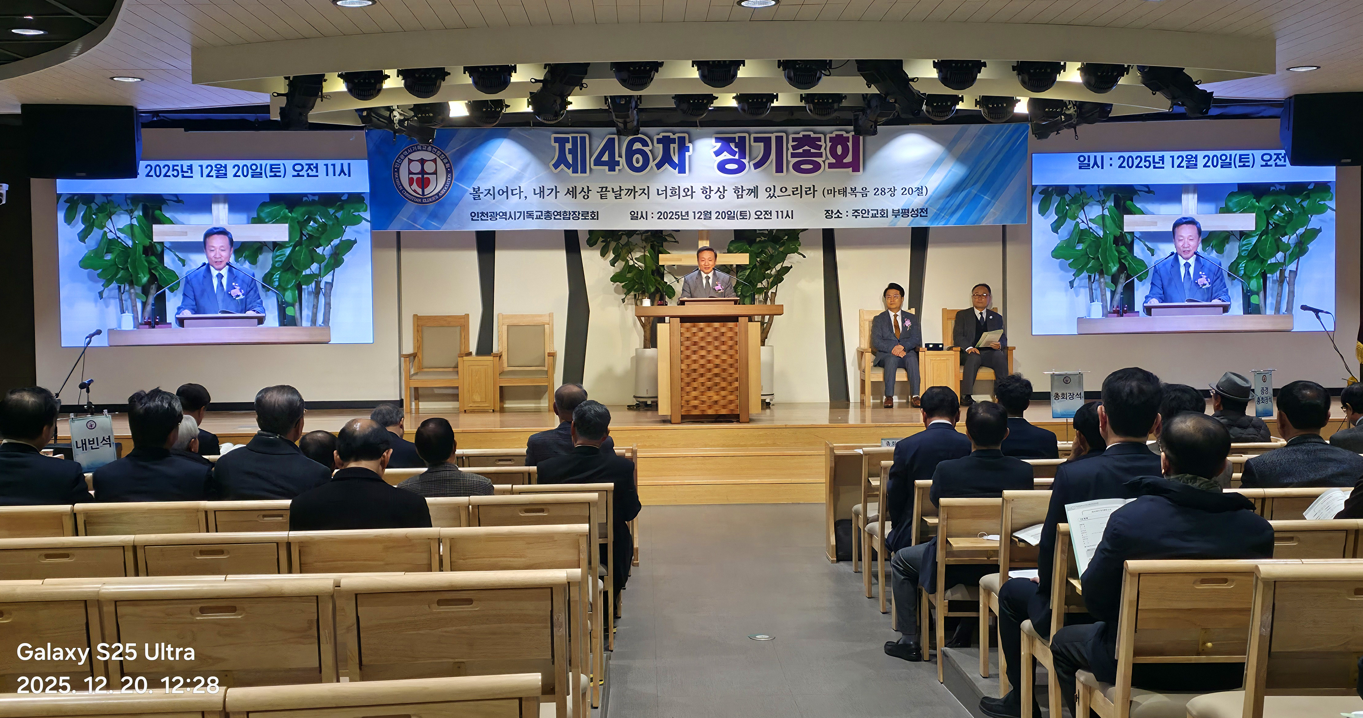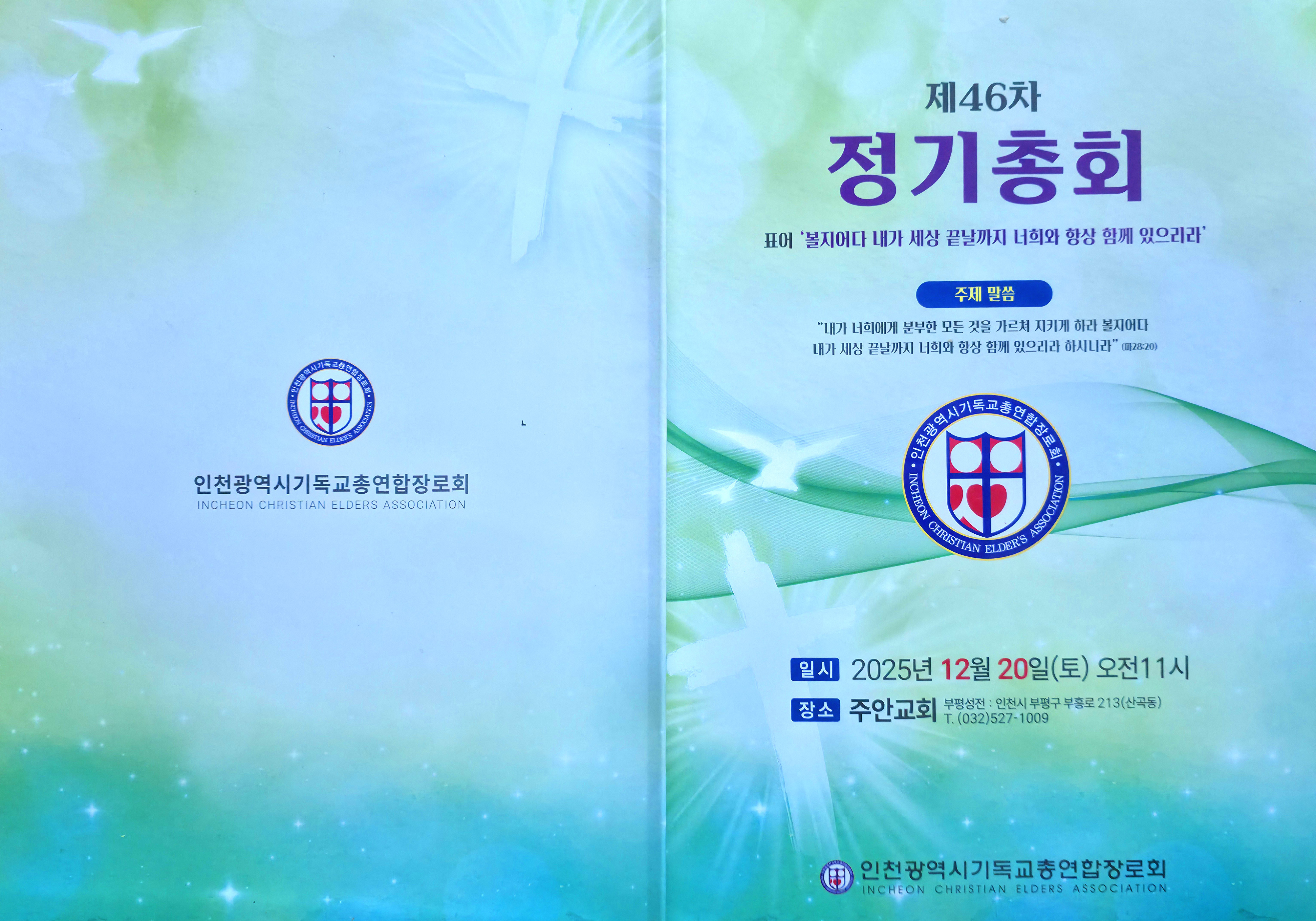인천광역시 기독교총연합장로회(총회장:김상배 장로) 제46회 정기총회를 2025년 12월 20일(토) 11시에 인천광역시 부평구 산곡동에 위치한 주안장로교회(나겸일 원로목사, 주승중 위임목사)에서 아래와 같이 제1부 예배, 제2부 정기총회, 제3부 이,취임식을 순으로 개최하였습니다.