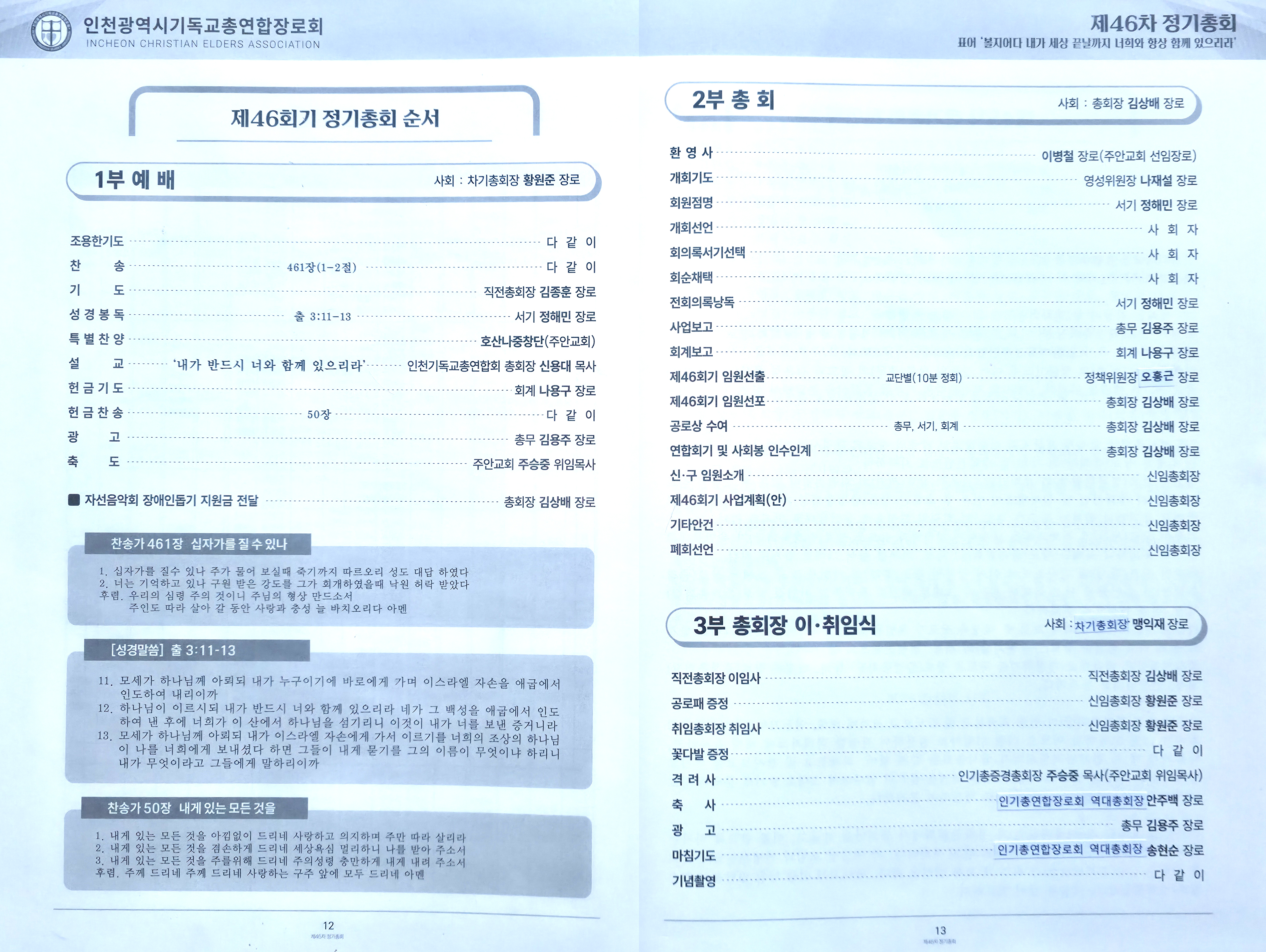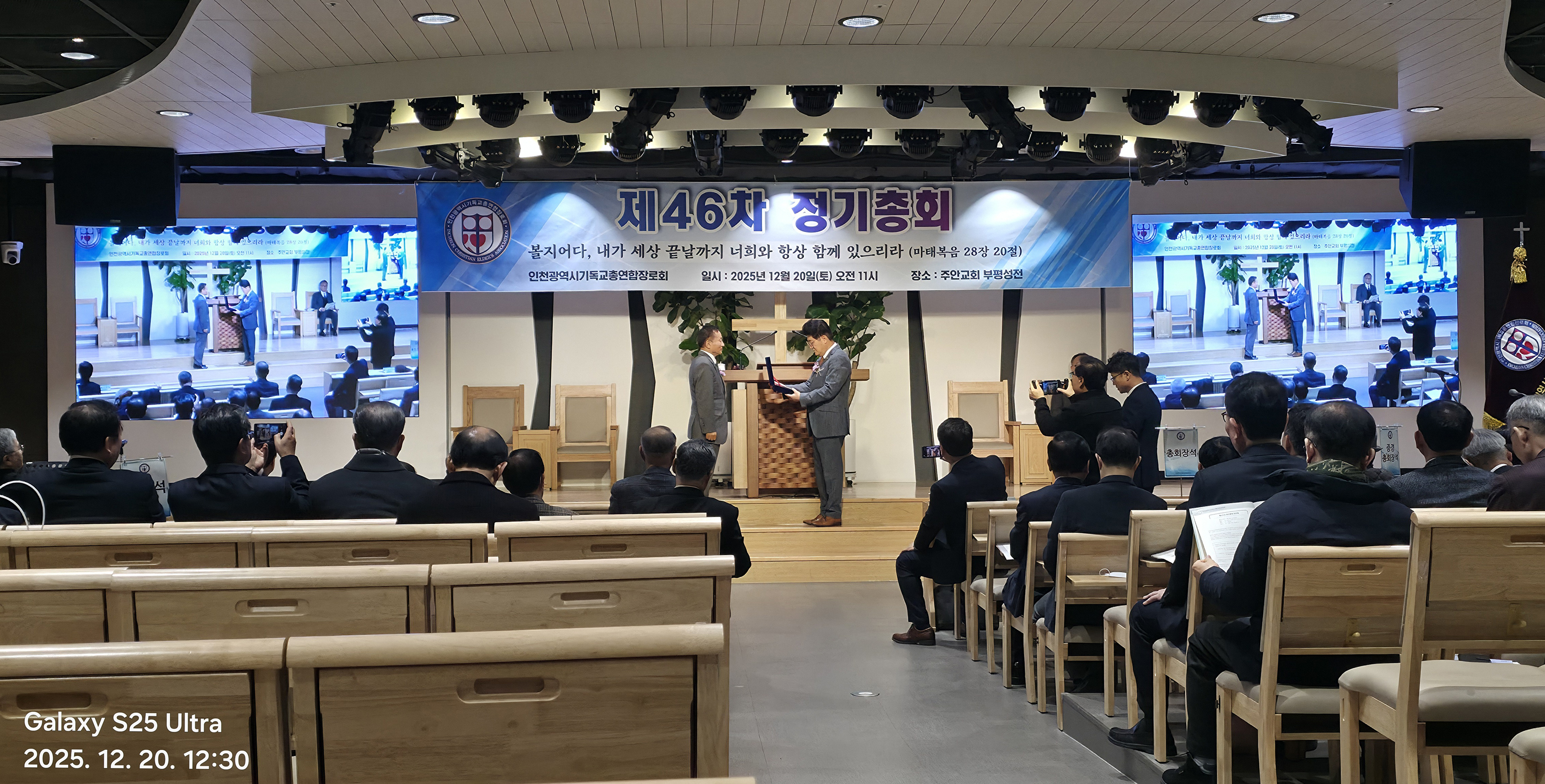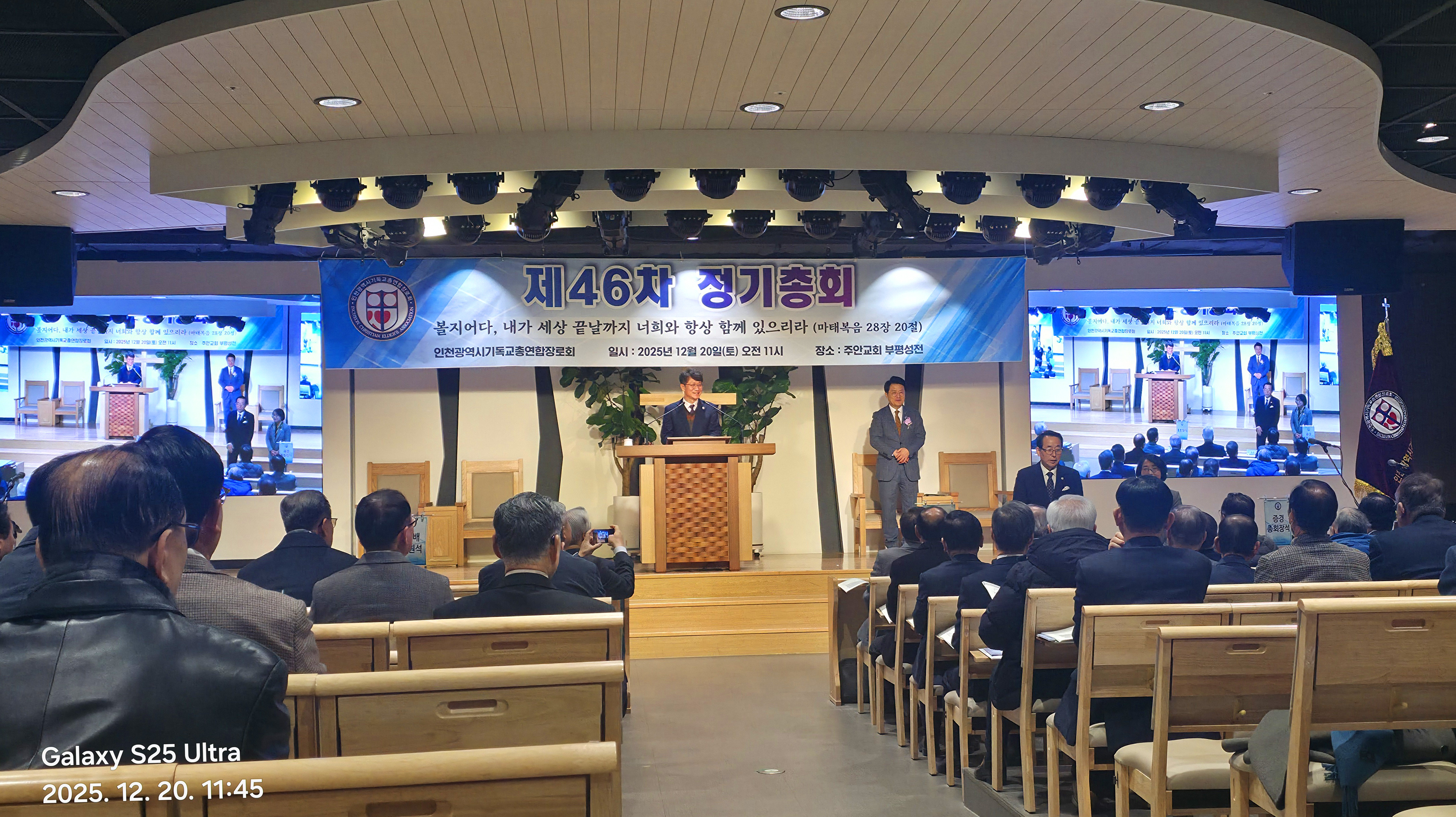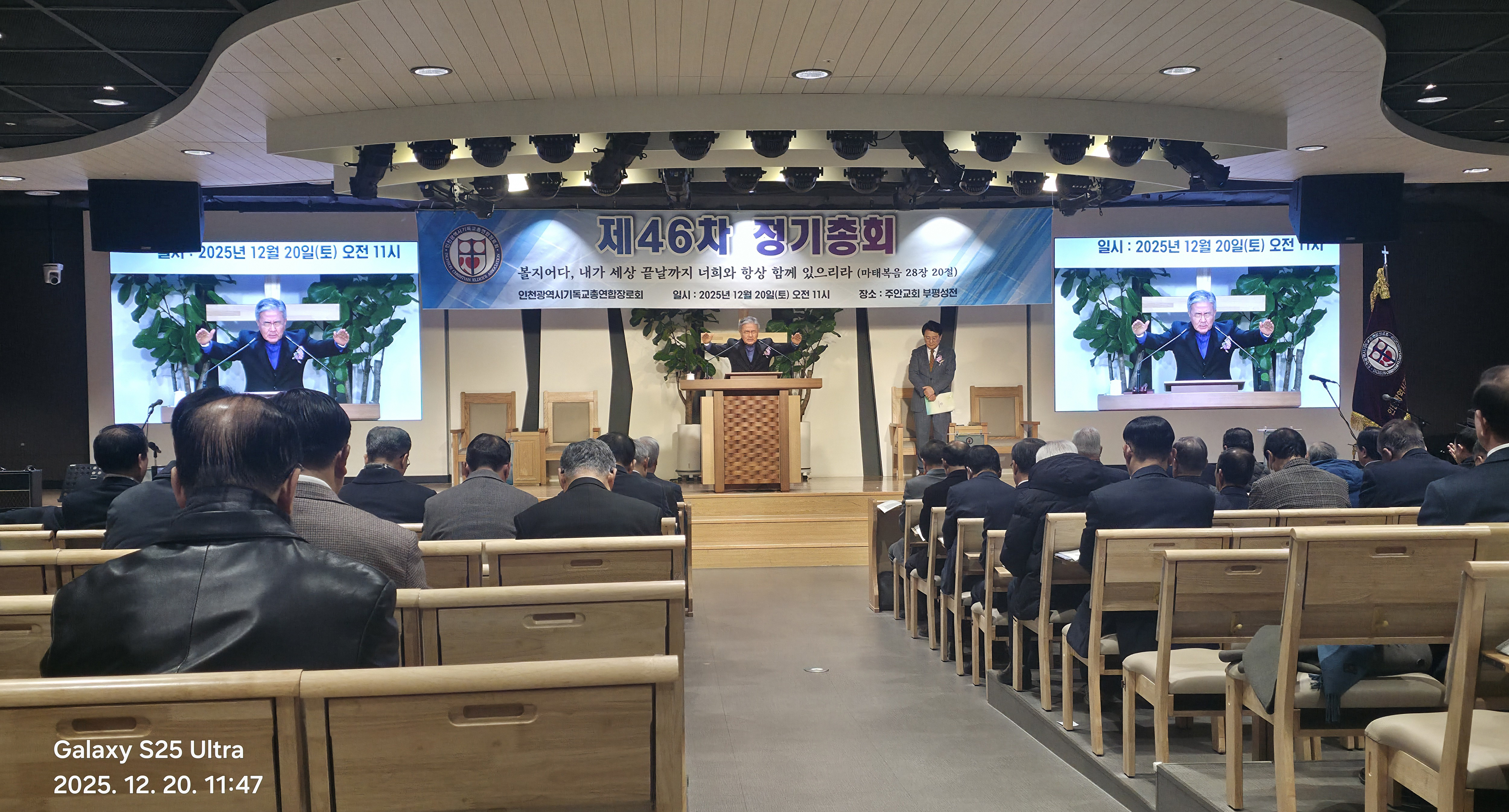 인천광역시 기독교총연합장로회(총회장:김상배 장로) 제46회 정기총회를 2025년 12월 20일(토) 11시에 인천광역시 부평구 산곡동에 위치한 주안장로교회(나겸일 원로목사, 주승중 위임목사)에서 아래와 같이 제1부 예배, 제2부 정기총회, 제3부 이,취임식을 순으로 개최하였습니다.