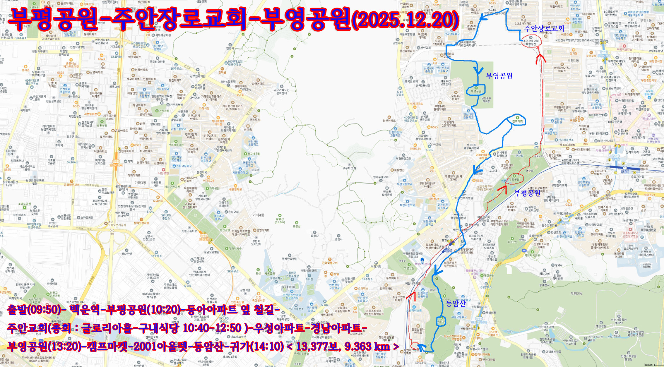 출발(09:50)- 백운역-부평공원(10:20)-동아아파트 옆 철길-주안교회(총회 : 글로리아홀-구내식당 10:40-12:50 )-우성아파트-경남아파트-부영공원(13:20)-캠프마켓-2001아울렛-동암산-귀가(14:10) < 13,377보, 9.363 km >