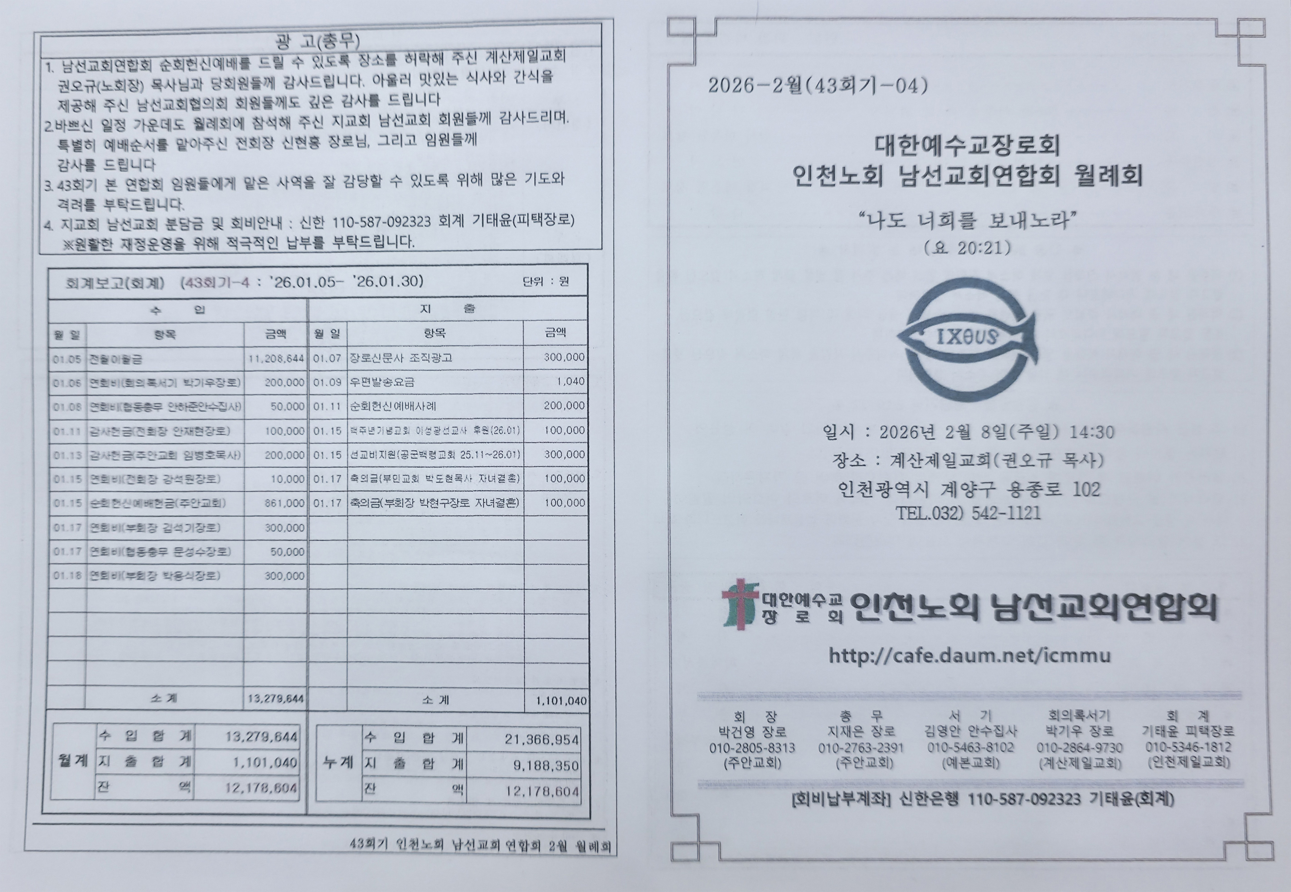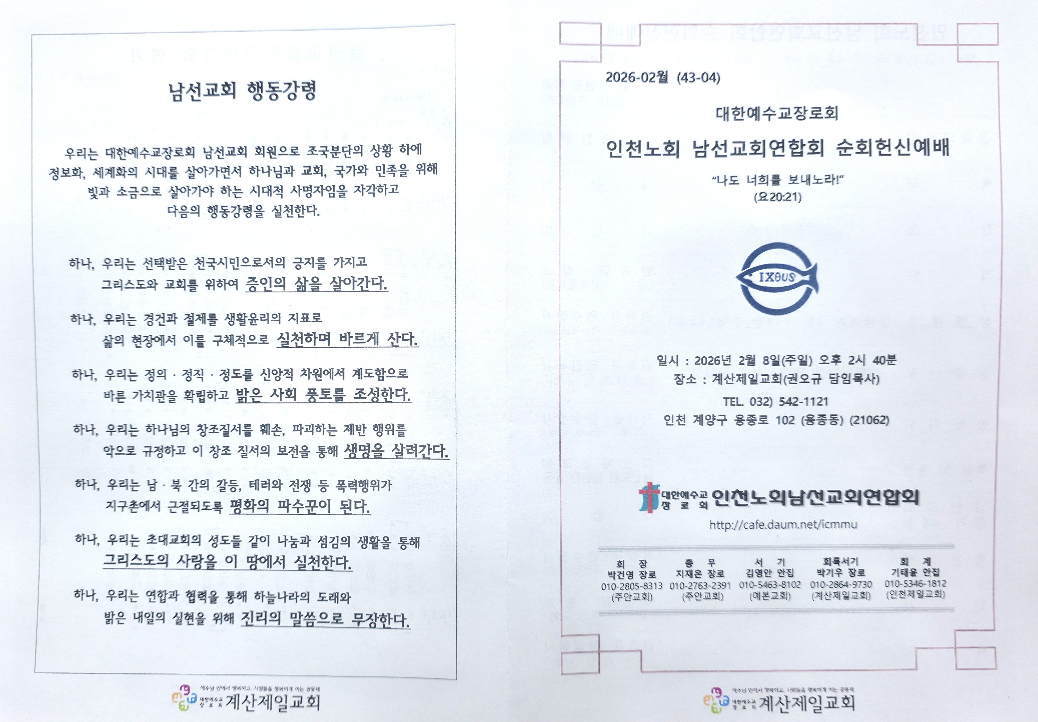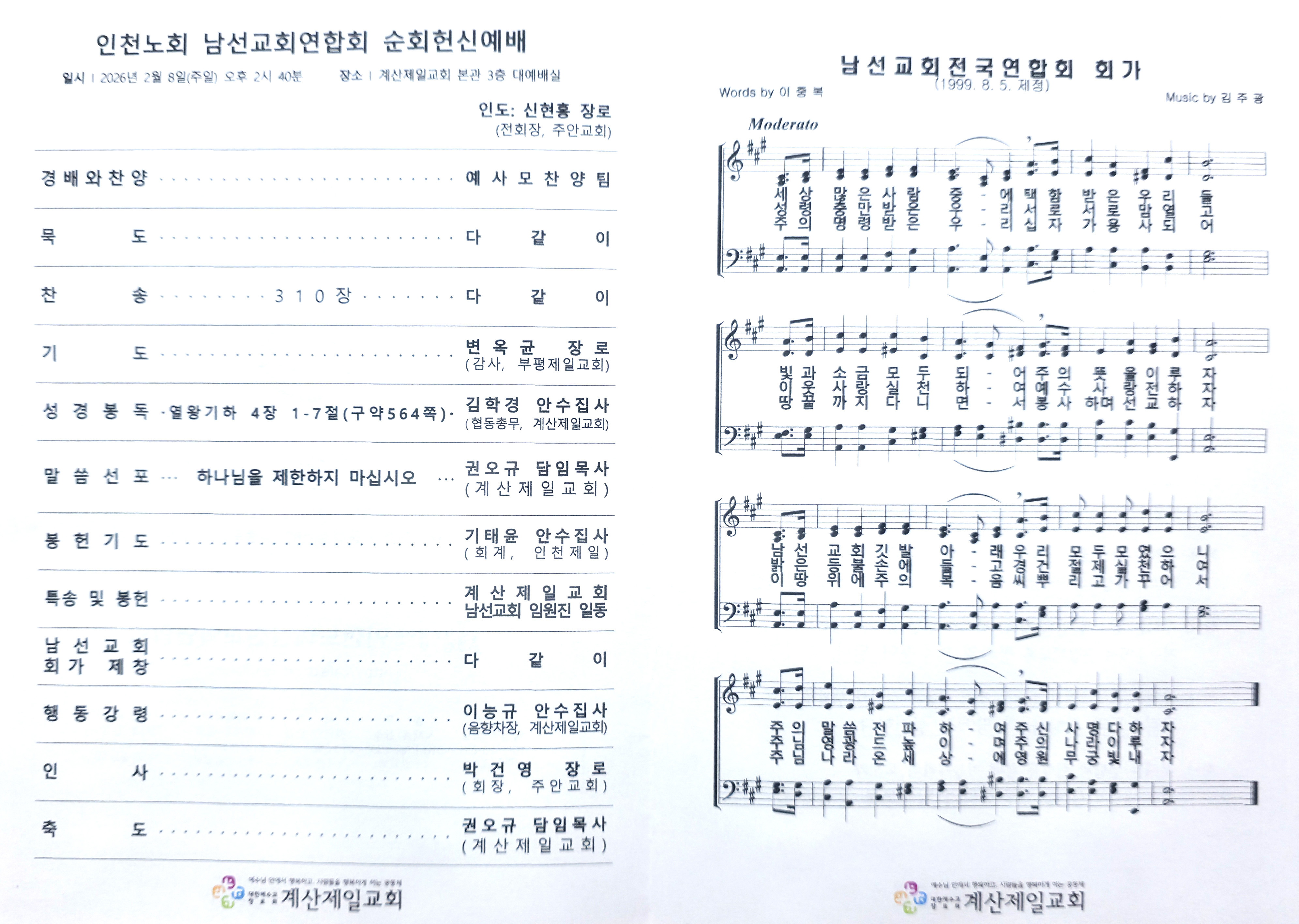 인천노회 남선교회연합회(회장 박건영 장로) 순회헌신예배를 2026년 2월 8일 14:30에 계양구 용종동에 위치한 계산제일교회(권오규 목사)에서 아래와 같이 드렸습니다.