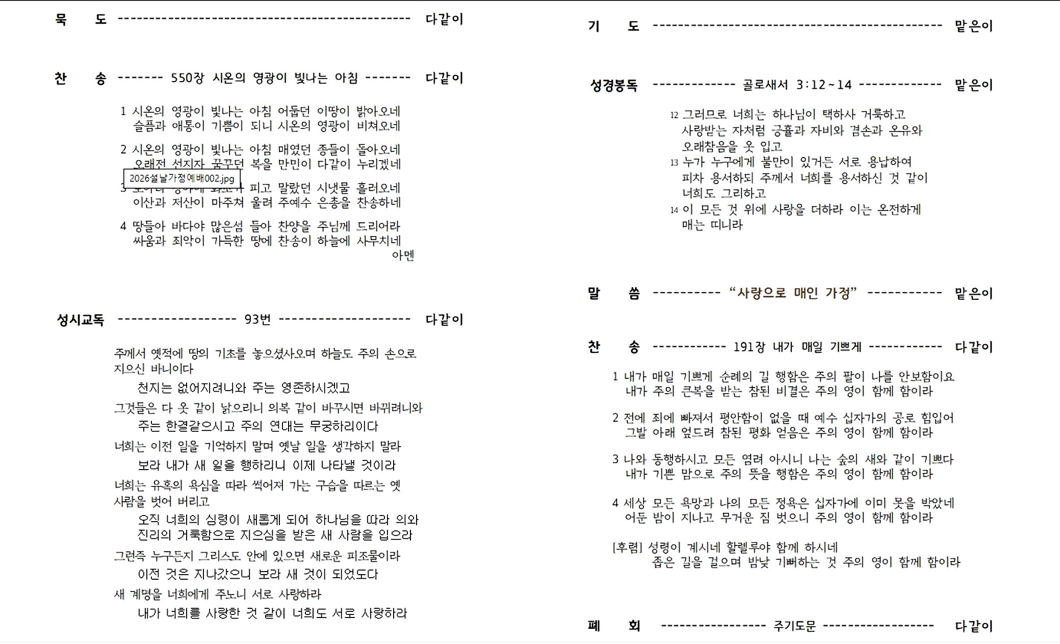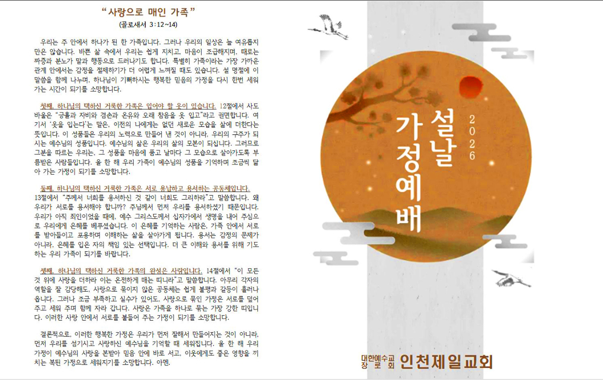 [스크랩] 인천제일교회 주일 찬양예배(2026.2.15) - 설날 가정예배로 대체 작성자SN. K|작성시간26.02.15|조회수5 목록 댓글 0 글자크기 작게가 글자크기 크게가 인천제일교회 주일 찬양예배(2026.2.15) - 설날 가정예배로 대체 다음검색 스크랩 원문 : 김상남 교수 카페 현재 게시글 추가 기능 열기 북마크 공유하기 신고 센터로 신고 댓글 댓글 0 댓글쓰기 답글쓰기 댓글 리스트
