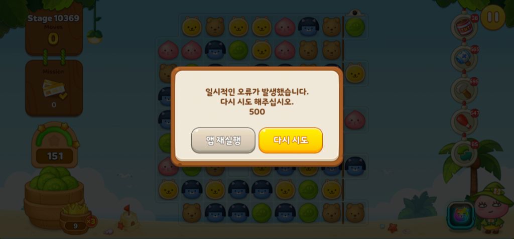 [오류/버그]500 에러만 보여요 계속! 작성자달팽이|작성시간25.12.18|조회수84 목록 댓글 2 글자크기 작게가 글자크기 크게가 아무래도 연승 끊긴게 아닌지 걱정이...하... 정말 ㅠㅠ 다음검색 현재 게시글 추가 기능 열기 북마크 공유하기 신고 센터로 신고 댓글 댓글 2 댓글쓰기 답글쓰기 댓글 리스트 작성자옹심22 | 작성시간 25.12.18 접솓도ㅠ안되요 .. 이미지 확대 작성자CM타운 가이드 | 작성시간 25.12.18 안녕하세요.먼저 게임 이용에 불편을 끼쳐 죄송합니다.게임 접속 시도 시 '500 오류창'이 노출되는 현상은 현재 확인 작업이 진행 중이며,아래의 공지로 안내드린 점 참고 부탁드립니다.● 12/18(목) 접속 불가 현상 관련 안내https://cafe.daum.net/fr.town/nnw5/1166 댓글 전체보기