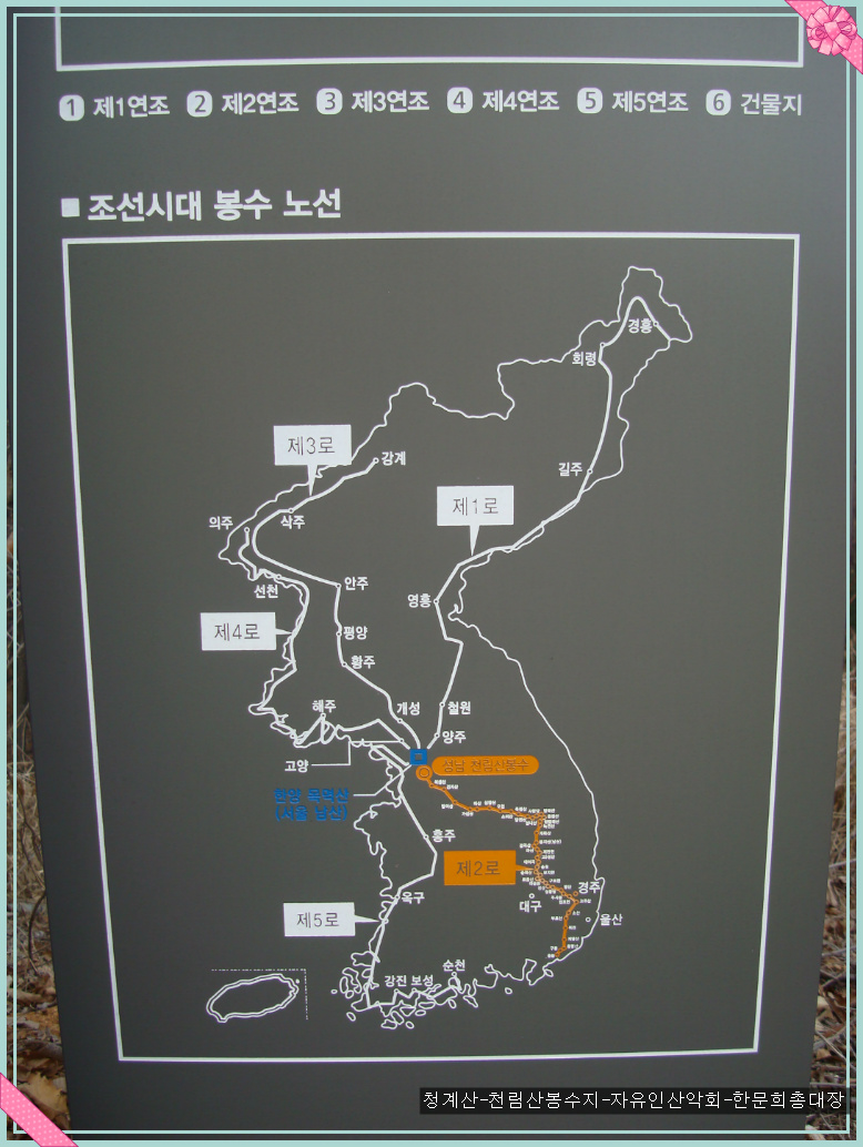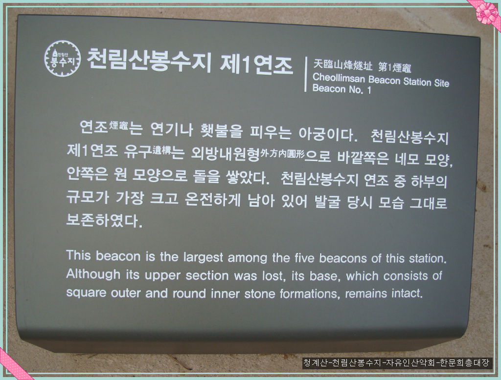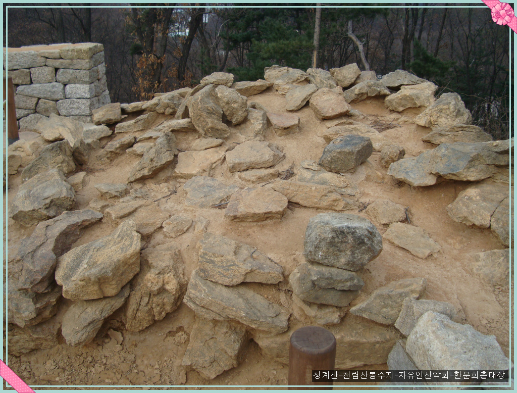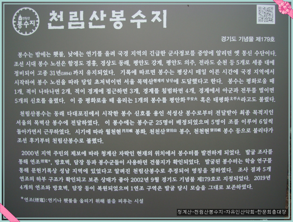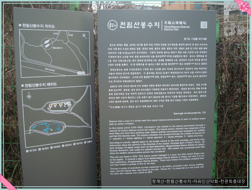 > ☞☞천림산 봉수지는 청계산이수봉에서 3.4km와 옛골마을 버스정유장에서 1.2km 지점에 있습니다, 또한 달래내고개와는 0.5km지점에 있어 언제든지 쉽게 접근하는데 용이합니다. 성남시 문화재관리국에서 발굴하여 복원조성을 하였습니다 관계자분들께 감사의 박수를 보냅니다..
