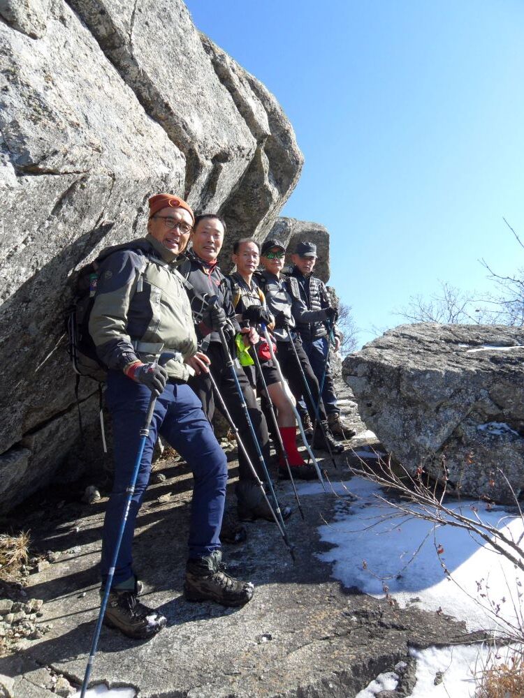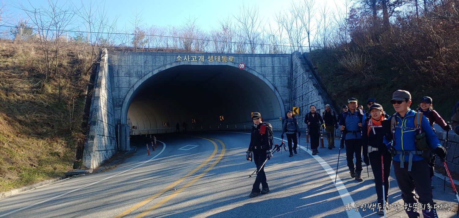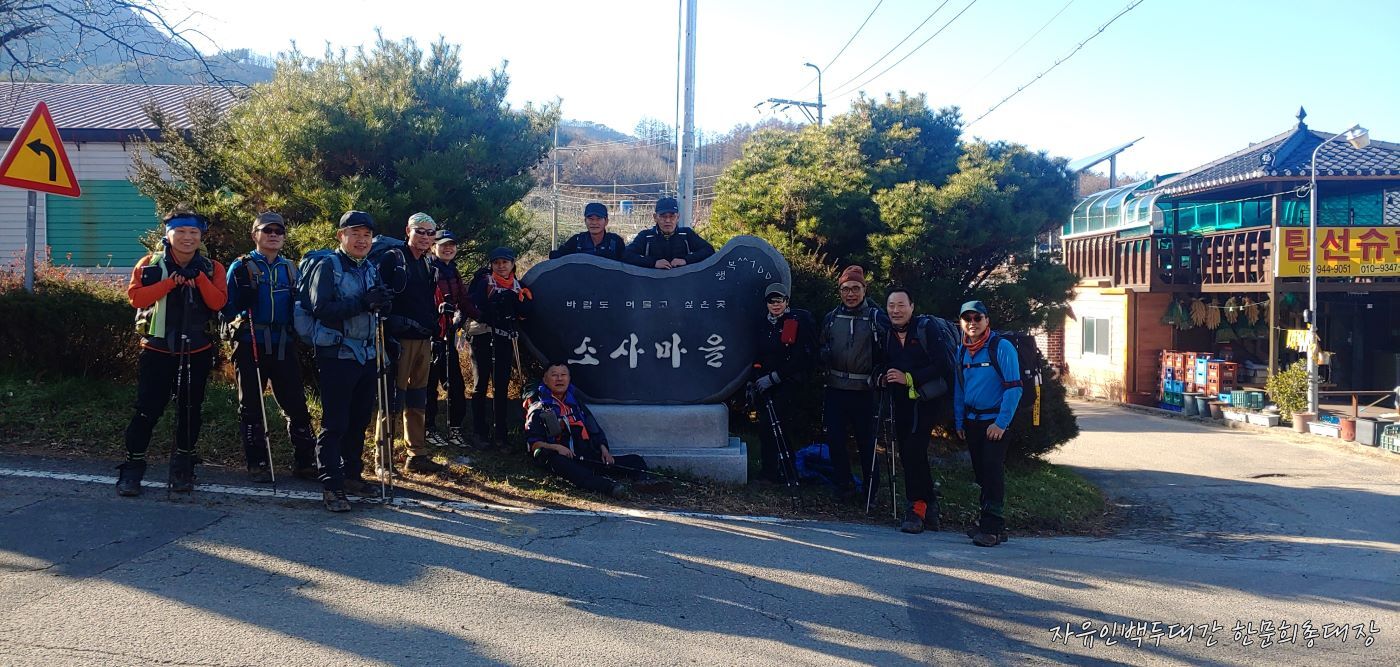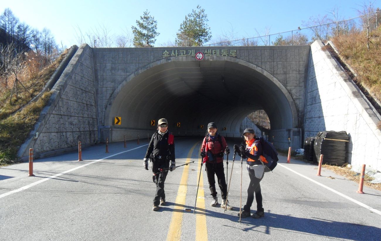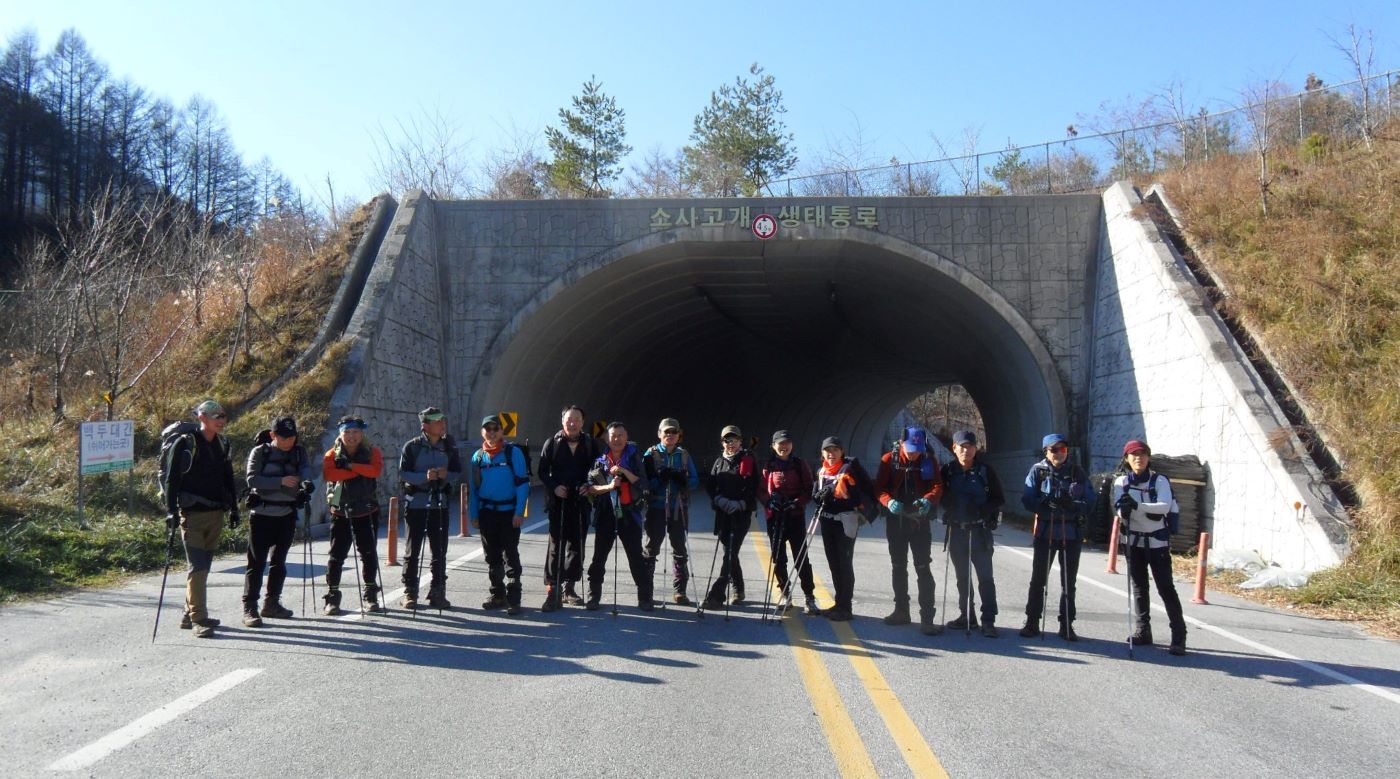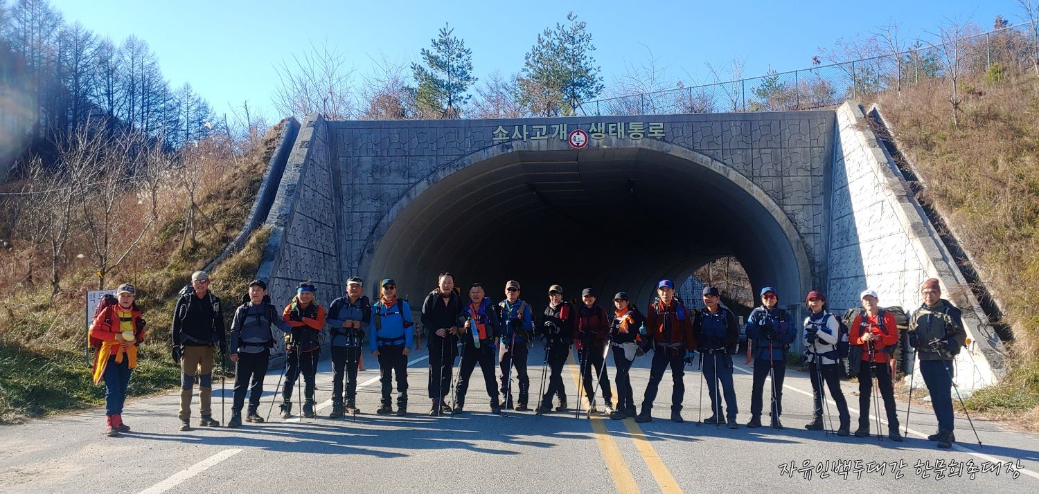 | 자유인 백두대간 25기-제18회차 삼봉-초점-대덕산구간 기록, ☞일시: 2021년 12월 5(일요), 기록: 한문희총대장 外 28명, ▶대간숲길: 신풍령 약수터-수정봉-금봉암안부-삼봉산-안부-고랭지밭-소사고개-목장-수도기맥분기점-초점산-대덕산-샘터-덕산재, 도상거리: 14km, 8시간소요, ♣특이사항: 전원 8시간에 종주, *총대장 H폰 분실 수도기맥분기봉에서~소사고개로 노상완회장과 하산, 소사고개에서 핸드폰 찾음, ※김영재 지인 최명란. 조증휘 지인 박명옥, 2분 참석 환영합니다. -07:25분, 서울 양재역 최종출발(대원 한사람 늦음), -10:21분, 신풍령 약수터 도착, 백두생태교육장 도로공사로 통제 수해로 도로유실(전북 무주군 무풍면 삼거리 산 1-5 빼재약수터, 063-322-9872) -10:31분, 빼재 약수터 출발(현재도로복귀공사중) -11:00시, 백두능선 이정표(빼재1.0km+삼봉산2.9km), -11:20분, 이정표(빼재2.0km+삼봉산1.9km), -11:29분, 이정표(빼재2.5km+삼봉산1.4km), -11:51분, 이정표(빼재3.4km+삼봉산0.5km), -12:00시, 정상직전 전망대(展望臺), -12:05~20분, 덕유삼봉산(德裕三峯山1255m), -12:47~13:25분, 이정표(삼봉산0.8km)안부에서 점심, -14:20~14:37분, 소사고개, 동물이동생태터널, 마을(고제면고제로1111탑선슈퍼), -14:57분, 농로 끝, 농막집, -15:02분, 竹山全公墓域, -15:13분, 염소목장입구, 초점산초입, -16:17분, 수도기맥 분기점(소사2.8km+초점산0.4km), -16:29분, 초점산(삼도봉1249m),(경남+경북+전북=3道), -17:16분, 대덕산(大德山1290m),이정표(덕산재3.5km+소사고개5.2km), -18:30분, 덕산재(德山峙644m), 山行終了, 선두7:20 후미8시간, -눈을 밟고 산행한 첫날이다. 겨울 날씨치곤 청명한 포근한 날씨였다. 들머리 2년전 수해로 유실된 도로를 공사중이다. 신풍령 南向 백두대간 생태교육장 아래에도 공사중으로 차량 통제를 하고 있다. 노상완 25기 기수회장이 교통사고가 있어 약2~3개월 활동 제약이 있었는데 이제 활동을 시작하였고 진부령까지 고고 하겠다고 대원들 앞에서 약속을 하였다. 회장님 복귀를 환영합니다. |