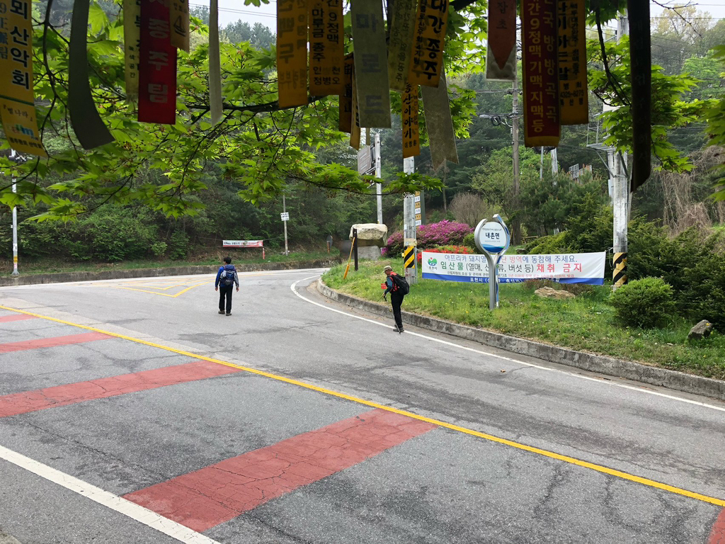 09:55 명덕삼거리. 청군로(56번도로)에서 봉화로가 갈라지는 삼거리. 가로질러 좁은 소로 우측 능선으로 올라선다.