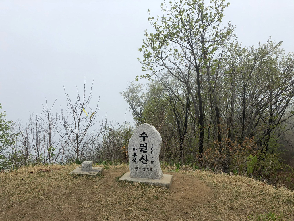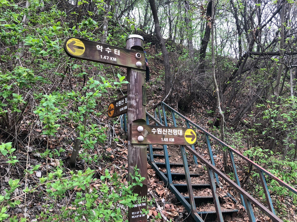 좌측 표식기를 무시하고 수원산 전망대크까지 올라가 베낭을 벗어 놓고 우틀. 철조망을 따라가면 포장도 나옴. 수원산 왕복 후 전망데크에서 우틀.