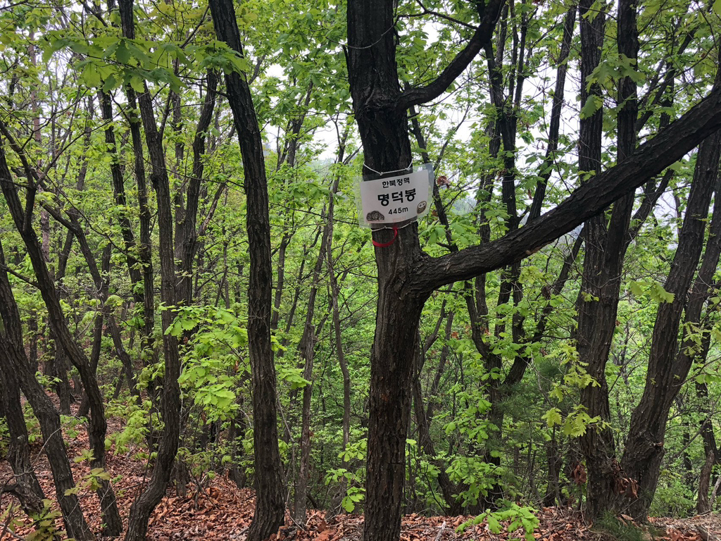 08:53 명덕봉(443m). 정맥에서 벗어나 있는 아치산 왕복은 주어진 시간에 맞출 자신이 없어 포기하고 명덕 삼거리 방향으로 내달린다.