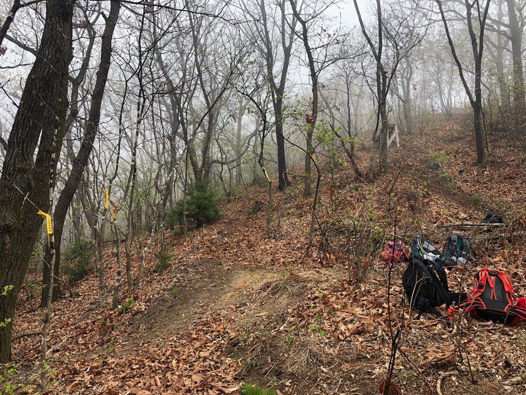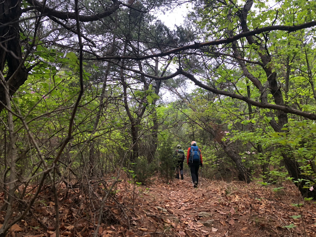 주위의 나뭇잎이 푸르러 갈수록 주변의 봉우리는 나뭇잎에 가려 능선에서 보기 힘들어 진다. 여름에 다가갈수록 짙은 녹색의 향연... 424봉 인듯