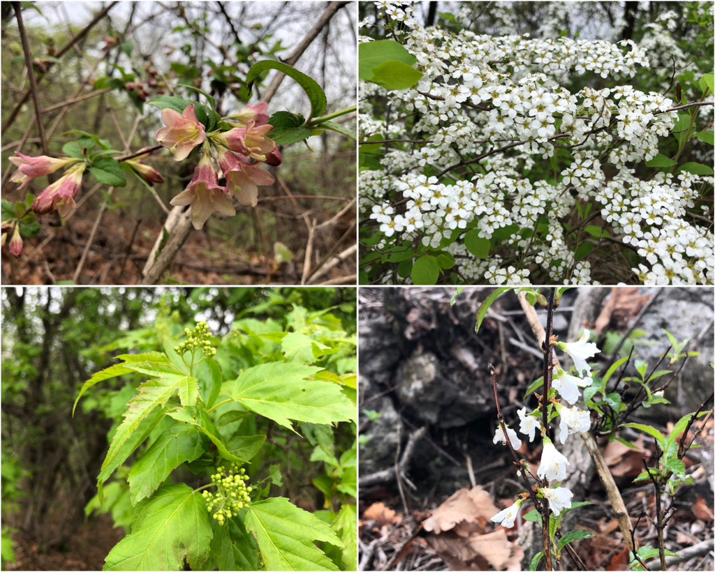 시계방향으로 병꽃나무. 조팝나무. 매화말발도리. 신나무. 신나무는 셋으로 갈라진 잎의 가운데 갈래가 가장 길게 늘어져 있다. 연노란색 작은 꽃.