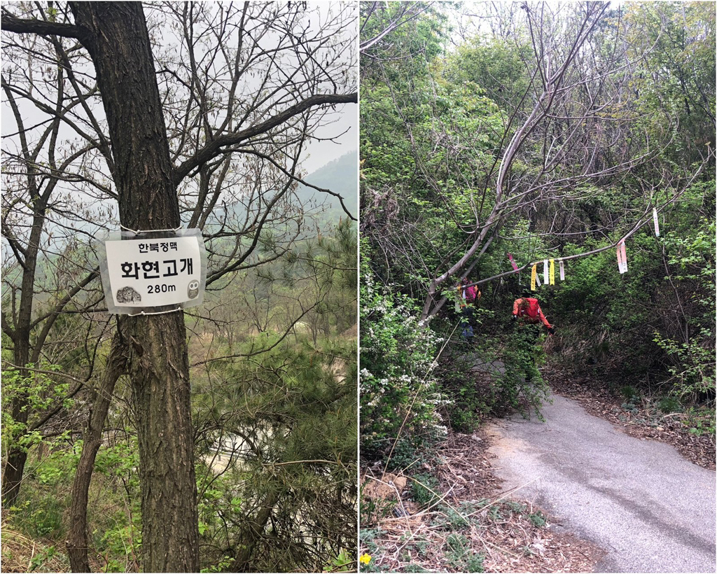 08:38 화현고개(280m). 버스에서 내려 산행 준비를 하는 동안 선두는 시야에서 멀어졌다.