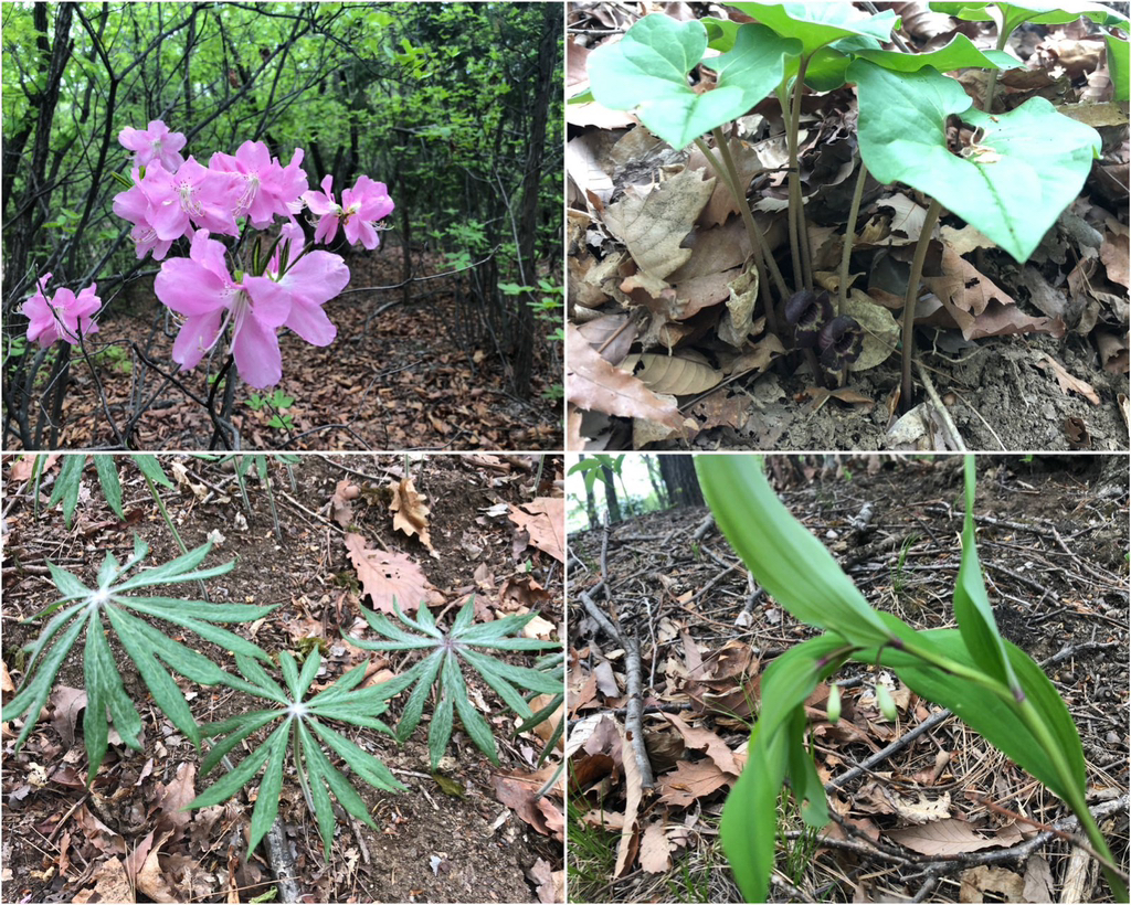 시계방향으로 철쭉. 털족도리풀. 둥굴레. 우산나물(첫째 잎은 둥글고 7-9개 장상으로 깊게 갈라지며 지름 35-40cm 꽃은 6-9월에 핀다)