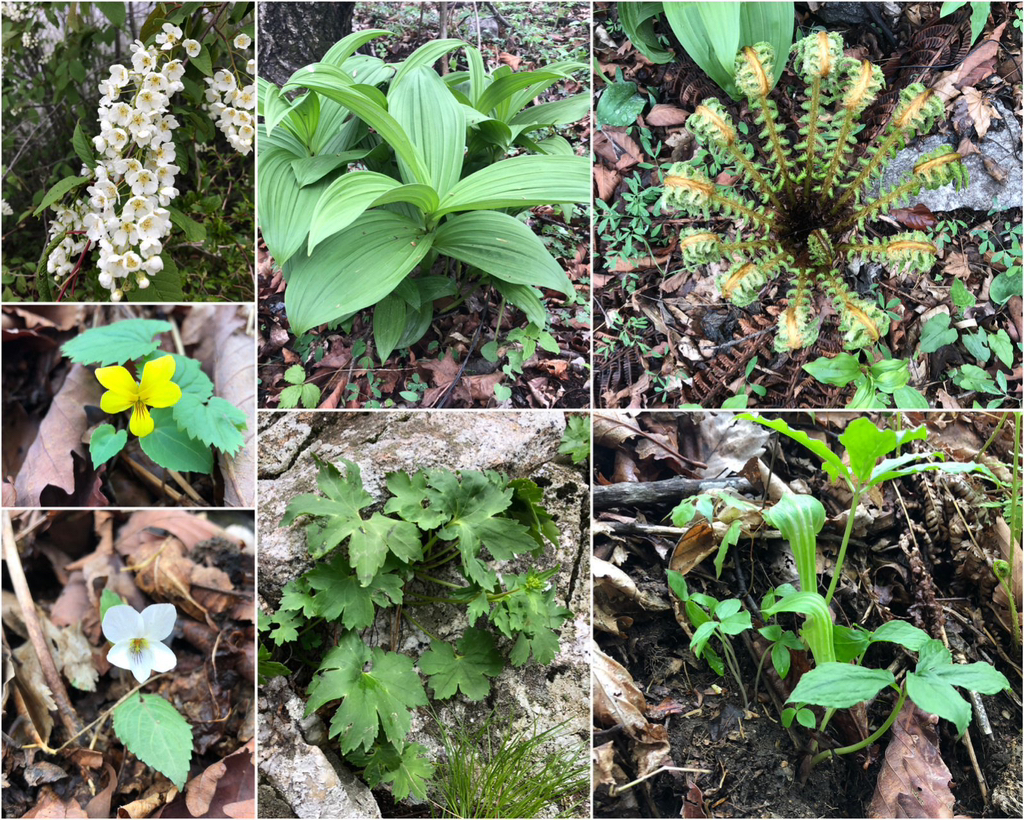 귀룽나무. 박새. 관중. 천남성. 돌단풍. 태백제비꽃. 노랑제비꽃.<관중. 잎을 활짝 편 모양이 과녁에 꽂힌 화살같이 보여서 관중이라고 부른다>
