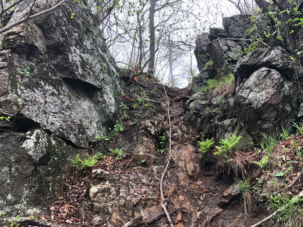 로프구간. 복주산 오르 내림 구간은 경사가 심하고 전날밤 비로 인해 부엽토가 질척거리고 미끄럽다. 로프가 설치되어 있으나 약간의 주의를 요했다.