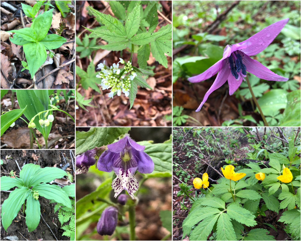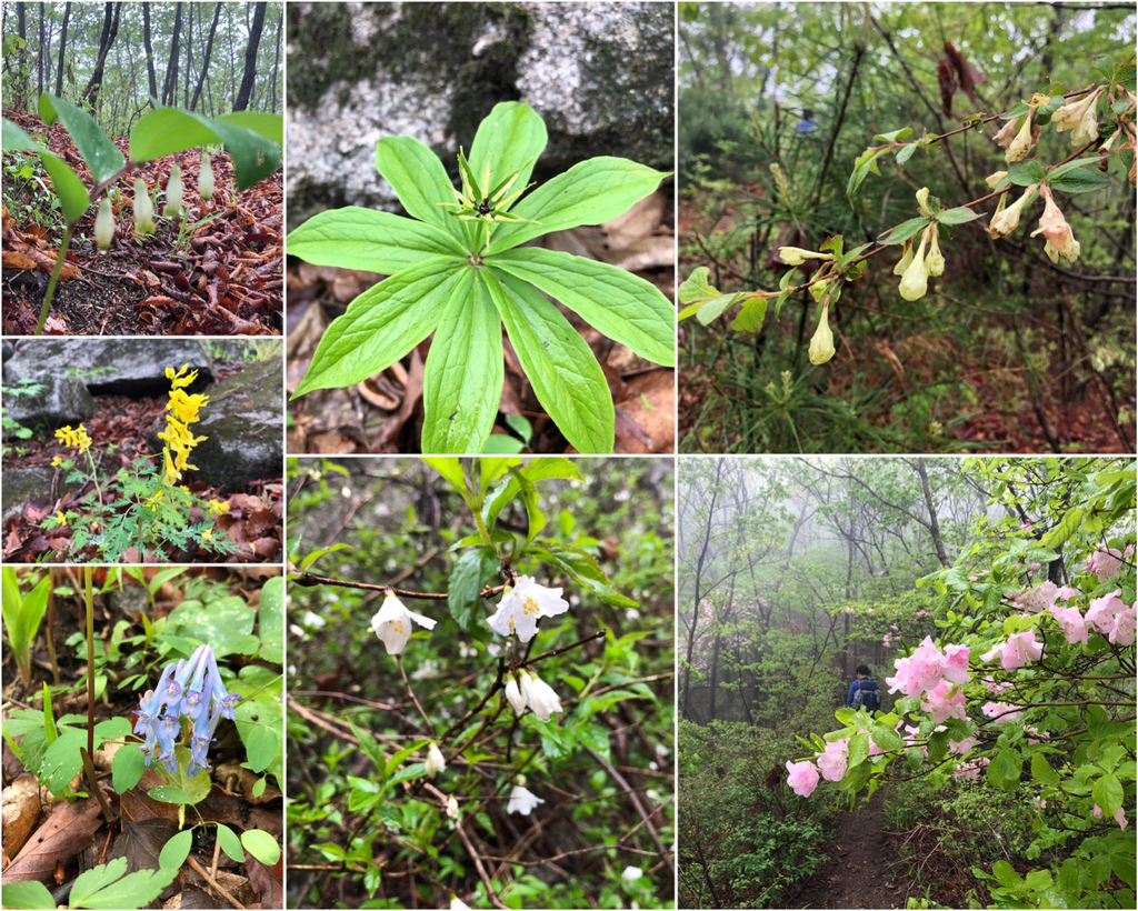 둥굴레. 삿갓나물. 병꽃나무. 철쭉. 매화말발도리. 현호색. 산괴불주머니.<삿갓나물. 잎이 돋아난 모양이 꼭 삿갓처럼 생겨서 붙여진 이름>