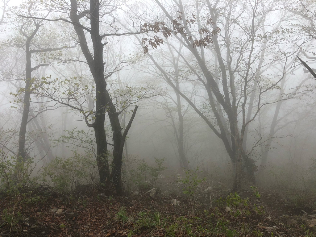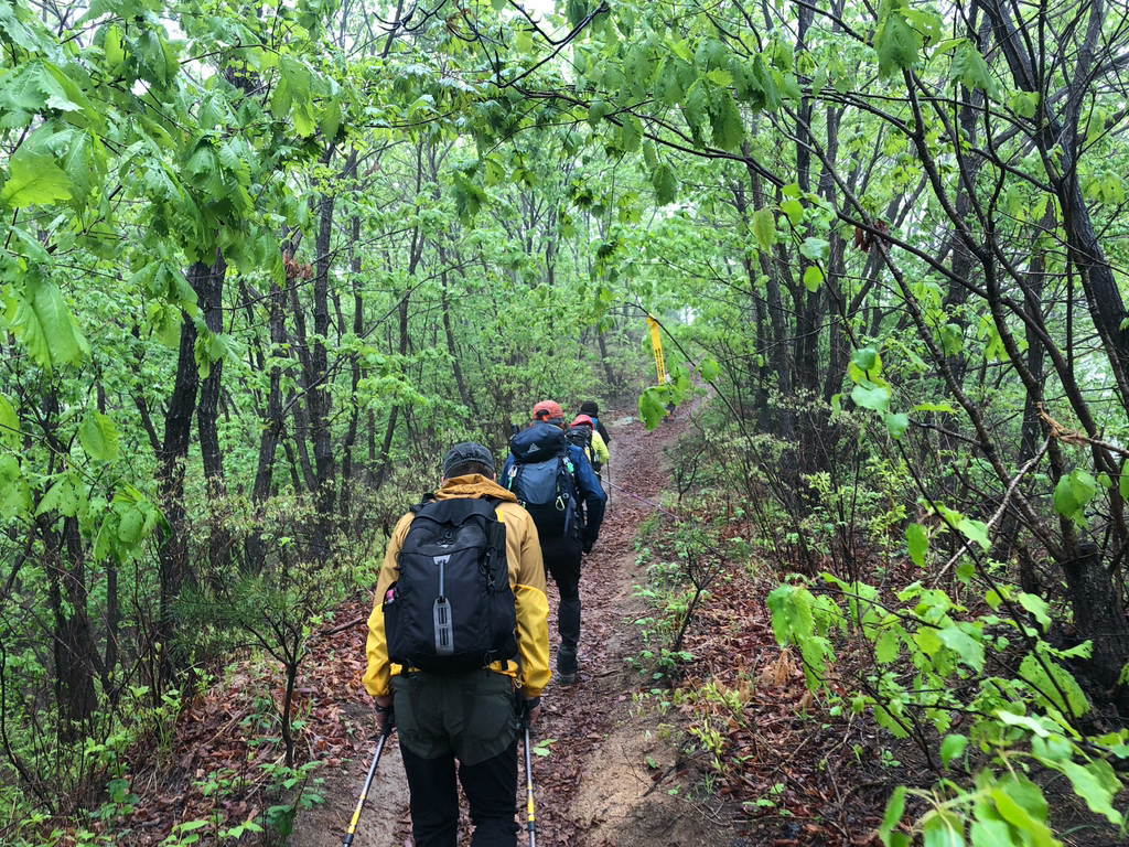이 구간은 한북정맥 첫 구간으로 진행하여야 했으나 산불예방 통제기간중 한북정맥을 시작하는 바람에 통제구간을 피해 도마령부터 시작을 해야 했다. 몇 구간 진행 후 통제 기간이 지나자 첫머리인 수피령을 찾았다. 오전까지 비가온다는 예보에 우중산행을 하지않을까 염려스러웠지만 집을 나설때 내리던 보슬비가 사당역에 도착했을 때는 안개비로 바뀌어 있었고, 비 예보 때문인지 지난회차까지 버스2대로 출발했던 인원이 절반으로 줄어들었다. 수피령에 도착할 무렵에는 안개비 마저 그치고 산등성이에는 구름이 피어나고 있었다. 날은 흐리지만 산행하기엔 좋은 날씨다. 다만 지난주 낙동정맥을 진행하며 몸상태가 좋지 않아 중탈했던 기억에 불안한 마음으로 비에 젖은 녹음속으로 들어 선다.