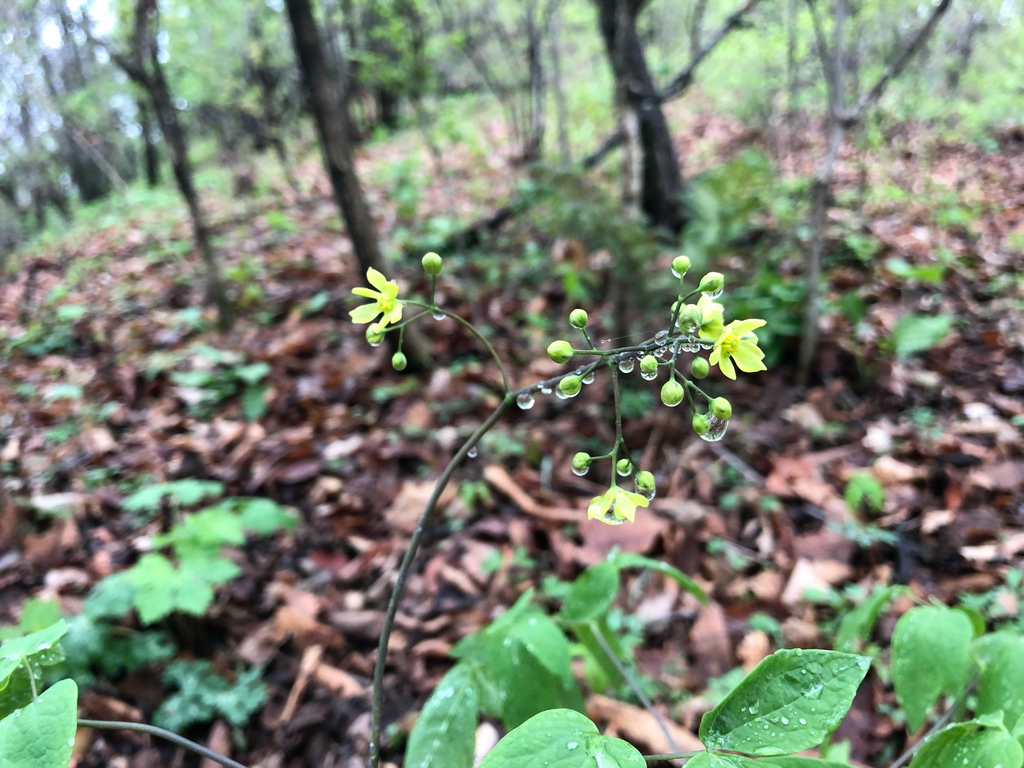 꿩의다리아재비. 높은 산 숲 속에 자라는 여러해살이풀. 꽃은 녹색이 도는 노란색. 줄기는 흰 분을 칠한 것 같다. 열매는 하늘색으로 익는다.